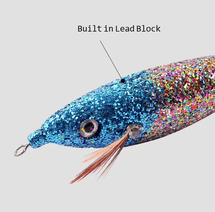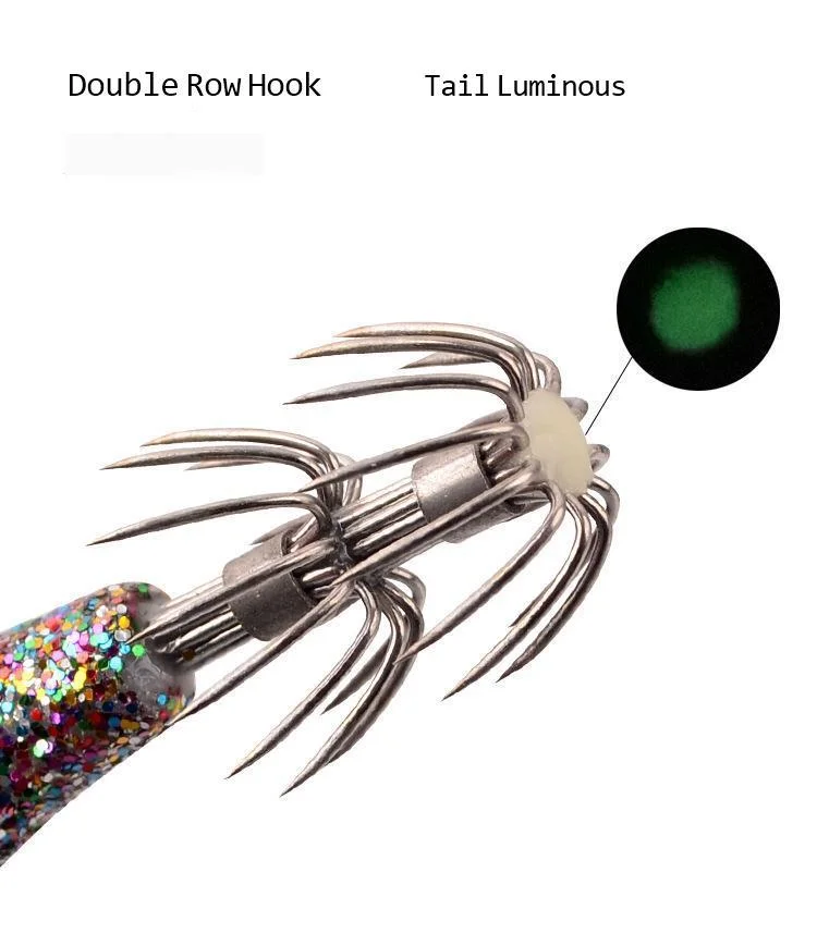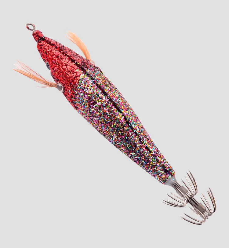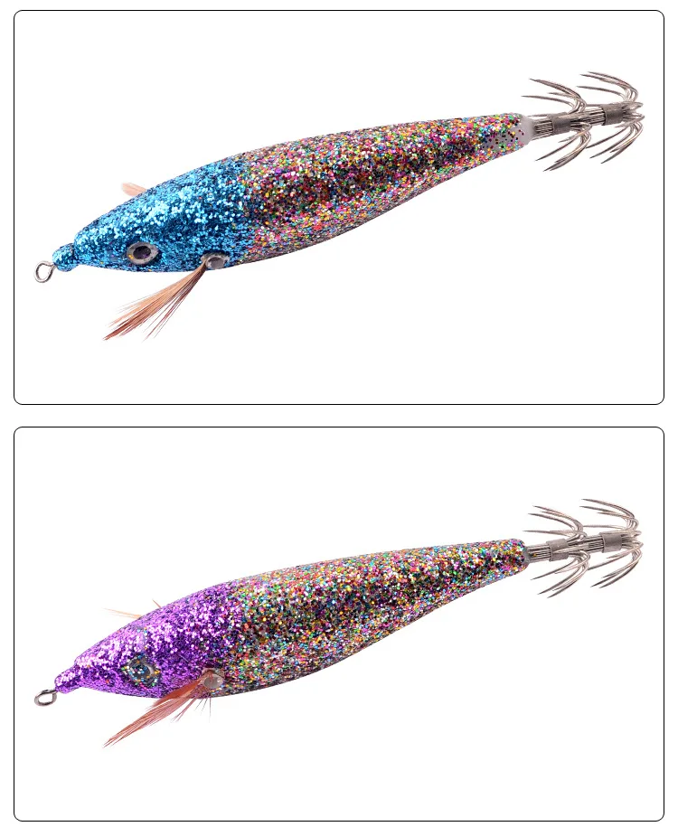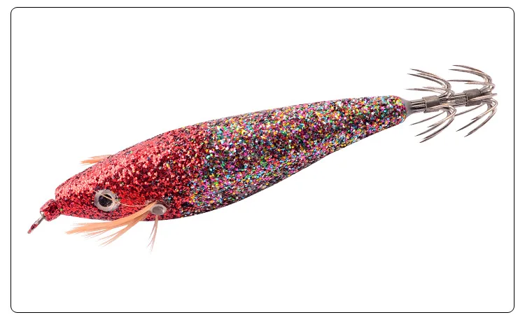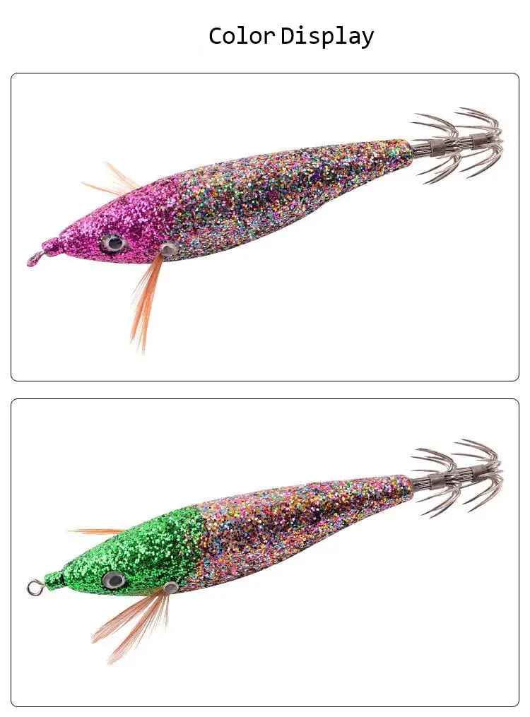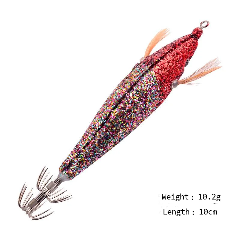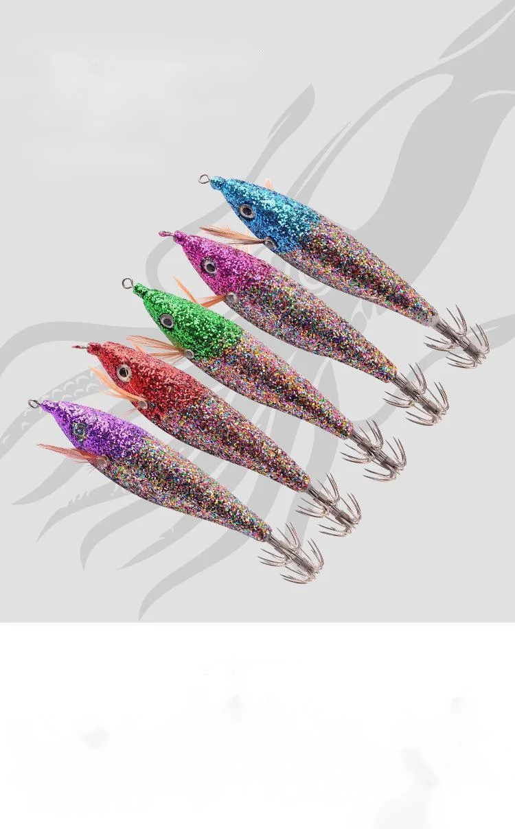 Anzuelo de Calamar de 10,2g, juego de cebo de camarón de madera con lentejuelas láser, lote de 5 unidades