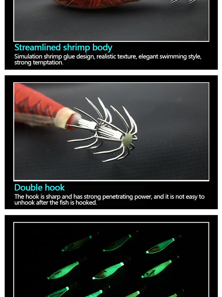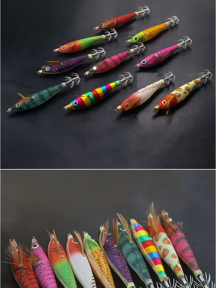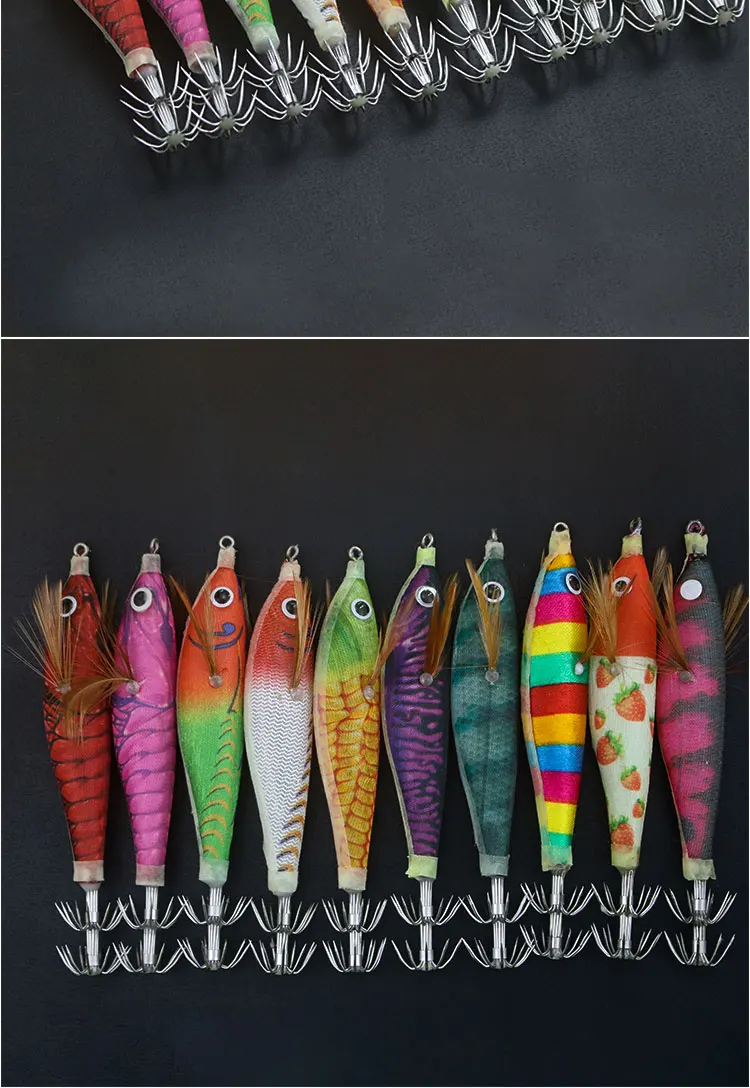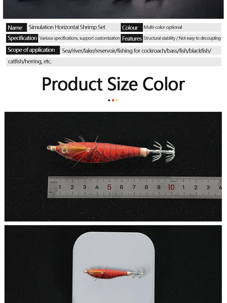 Anzuelo de calamar de camarón de madera artificial, cebo de pesca de calamar luminoso, cebo de pesca de camarón de madera, cebo falso, 10 piezas