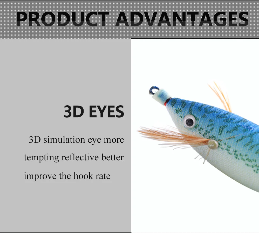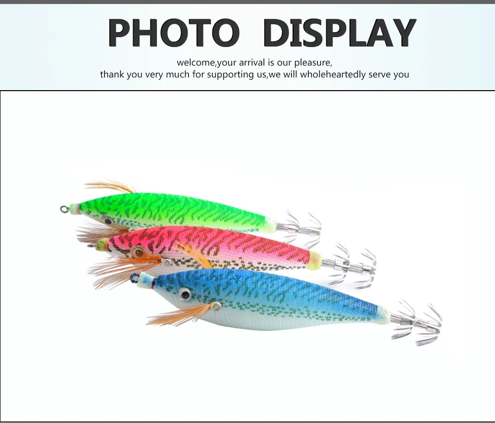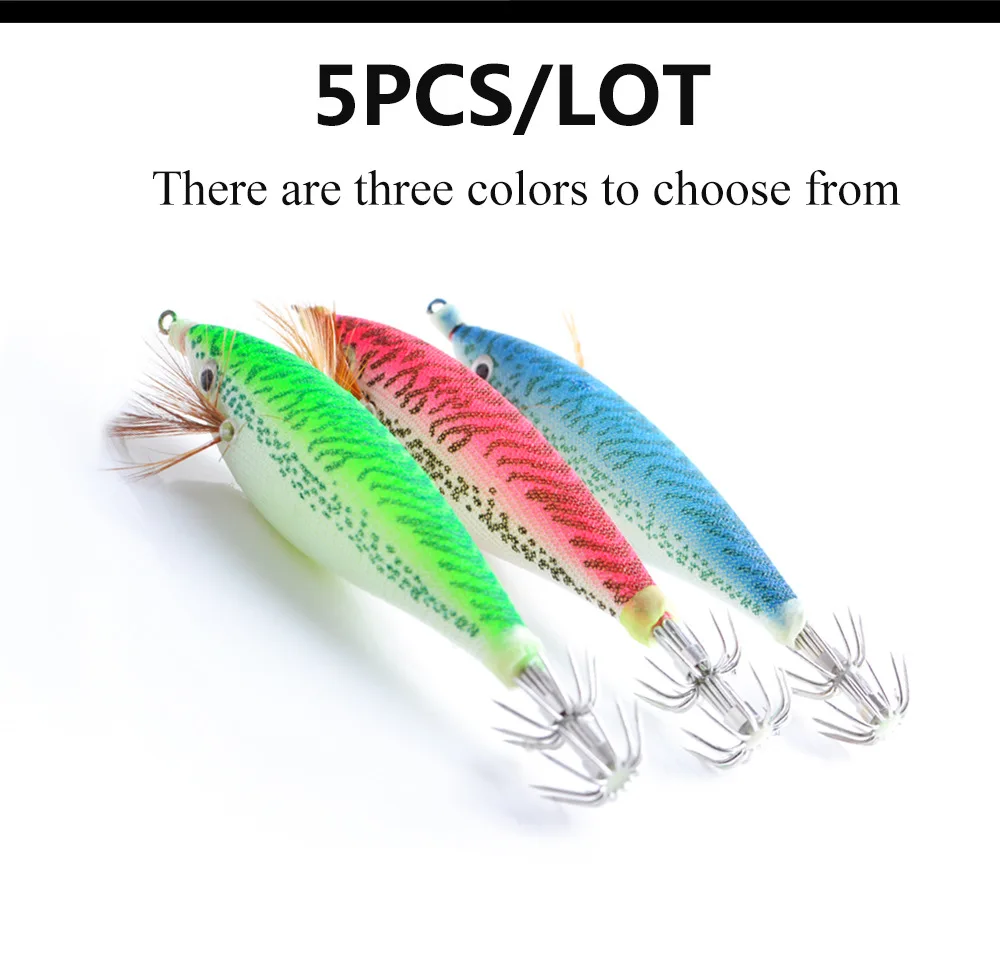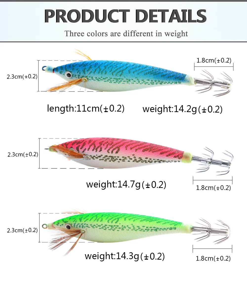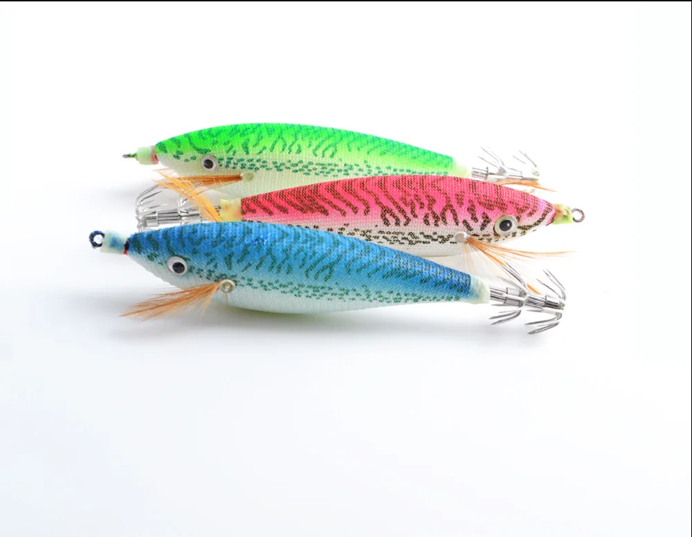 Anzuelo de calamar de camarón de madera luminosa 11cm 14,7G accesorios de Señuelos de Pesca artificiales ojos de cristal 3D cebo Luya sepia cebo duroColor: rojo, azul, verde