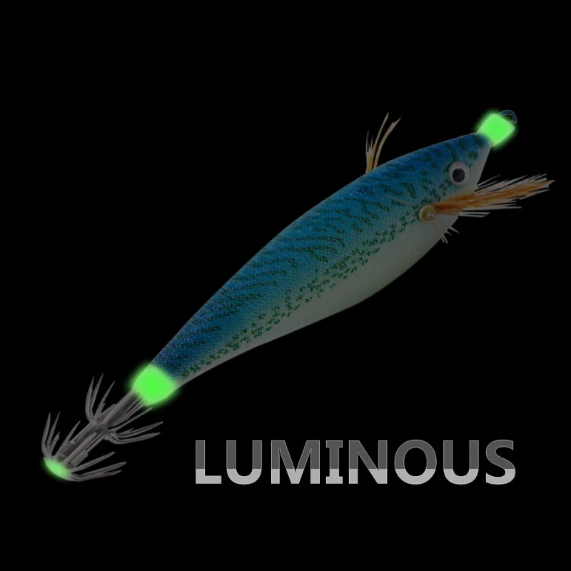 Anzuelo de calamar de camarón de madera luminosa 11cm 14,7G accesorios de Señuelos de Pesca artificiales ojos de cristal 3D cebo Luya sepia cebo duroColor: rojo, azul, verde