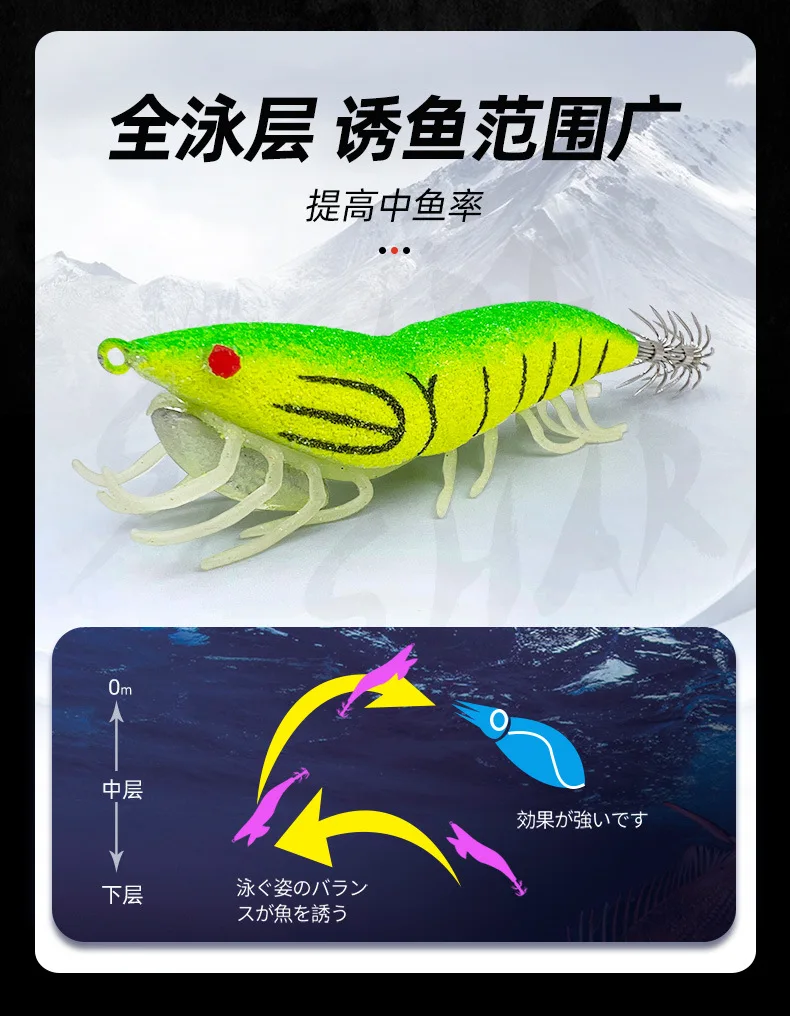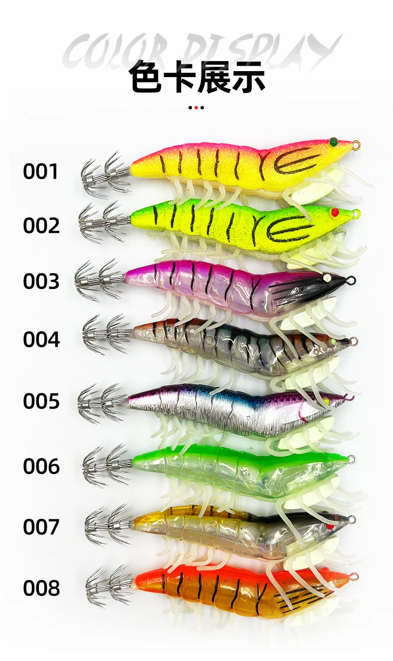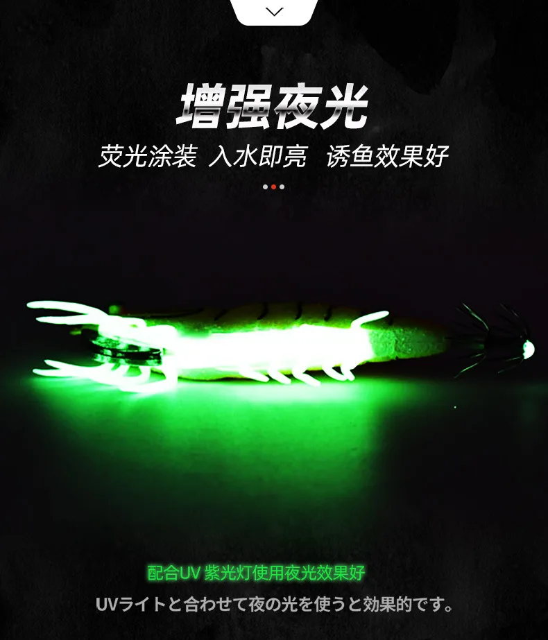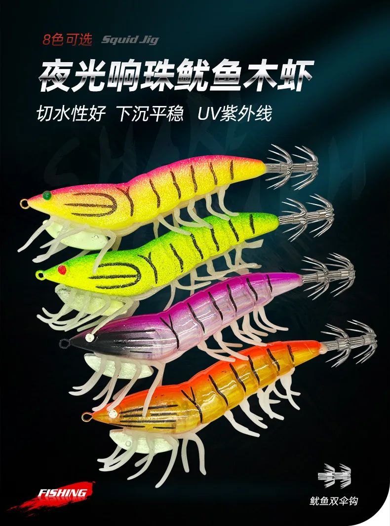 Anzuelo de calamar de camarón de madera con luz nocturna, cebo de pesca de mar, cebo falso, Cuenta de sonido, camino de camarón suave
