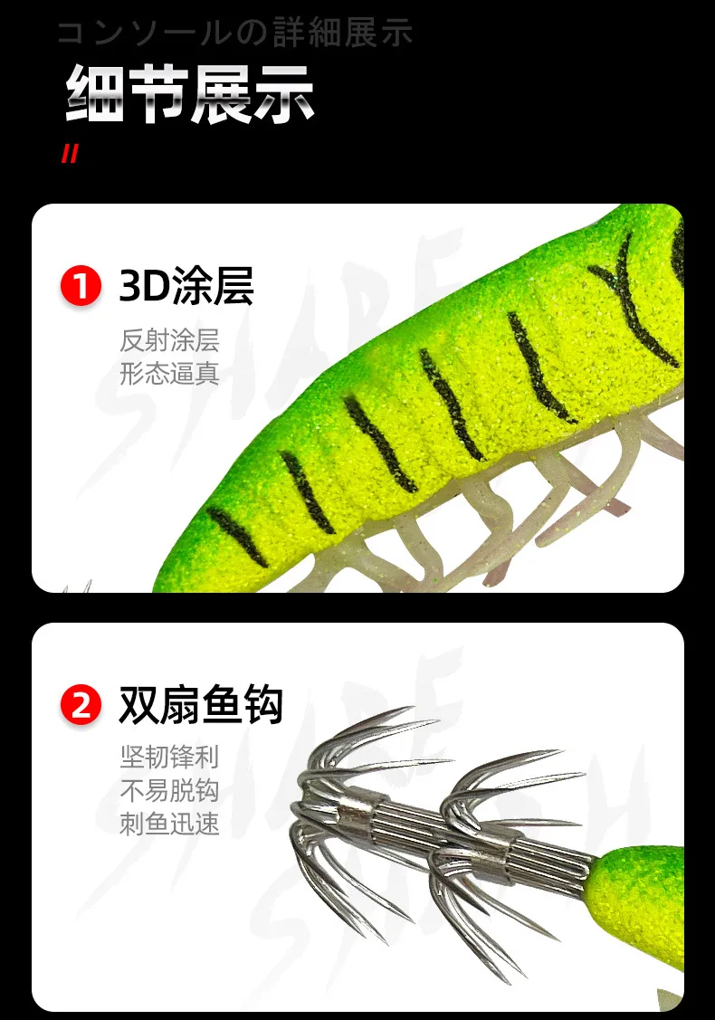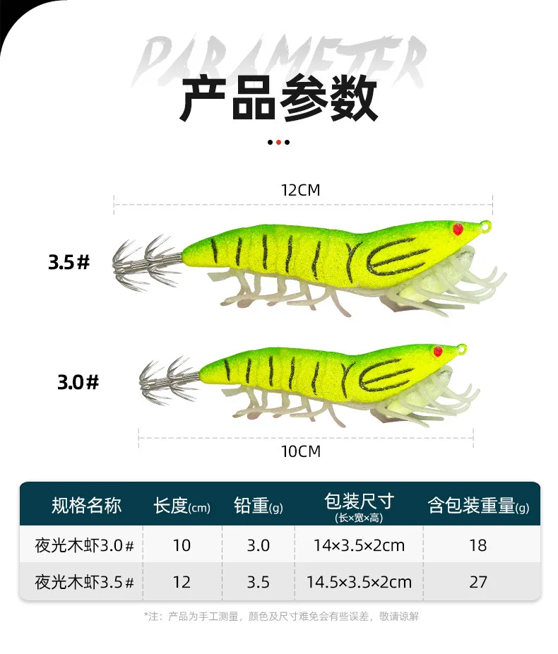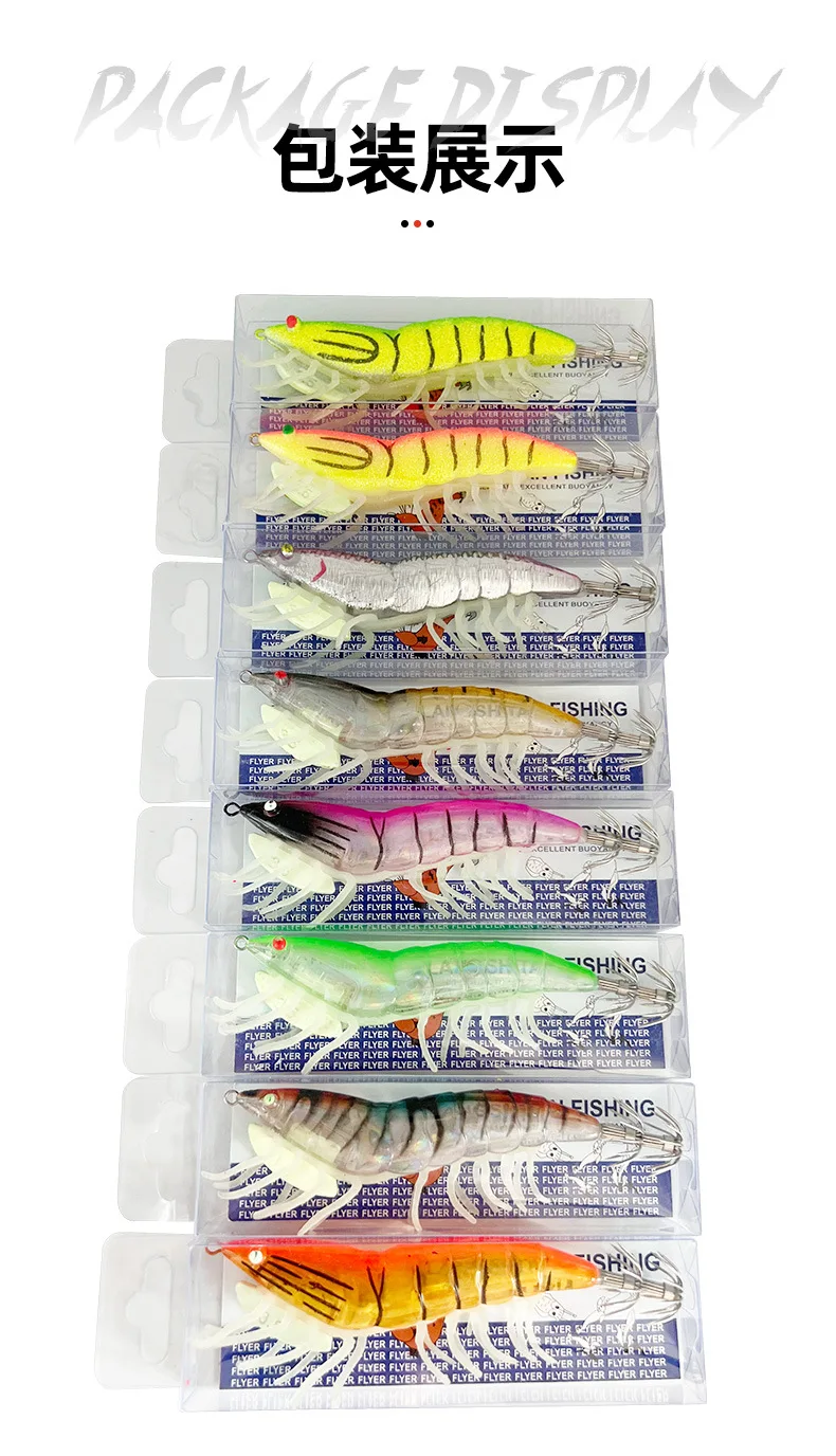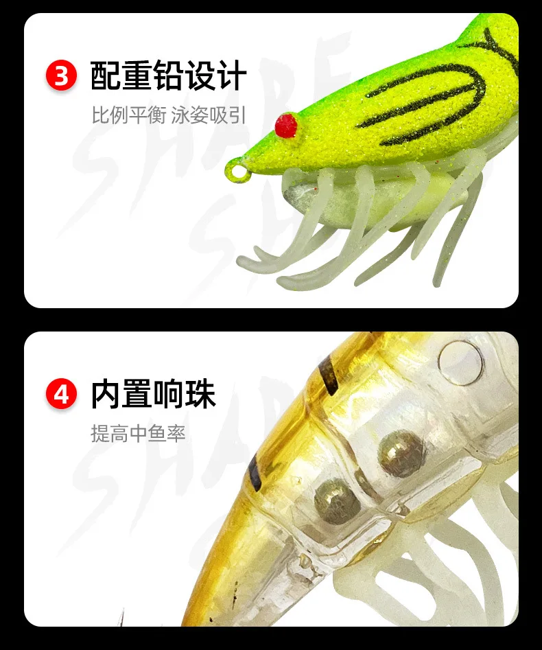 Anzuelo de calamar de camarón de madera con luz nocturna, cebo de pesca de mar, cebo falso, Cuenta de sonido, camino de camarón suave
