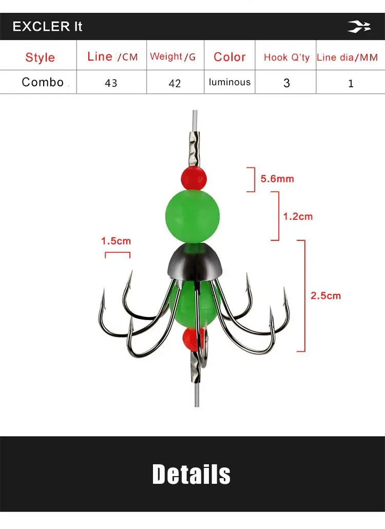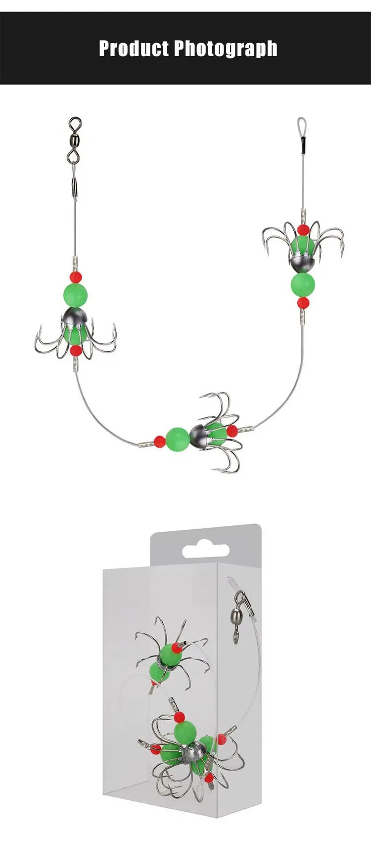 Nombre: gancho luminoso de ocho garrasTamaño: aproximadamente 43 cmPeso: aproximadamente 10 gMaterial: acero inoxidableConfiguración: un juego contiene tres grupos de ganchos luminosos de ocho garrasEmbalaje: paquete independienteCaracterísticas: 3 grupos con anzuelos de plomo de ocho garras, mayor tasa de pesca