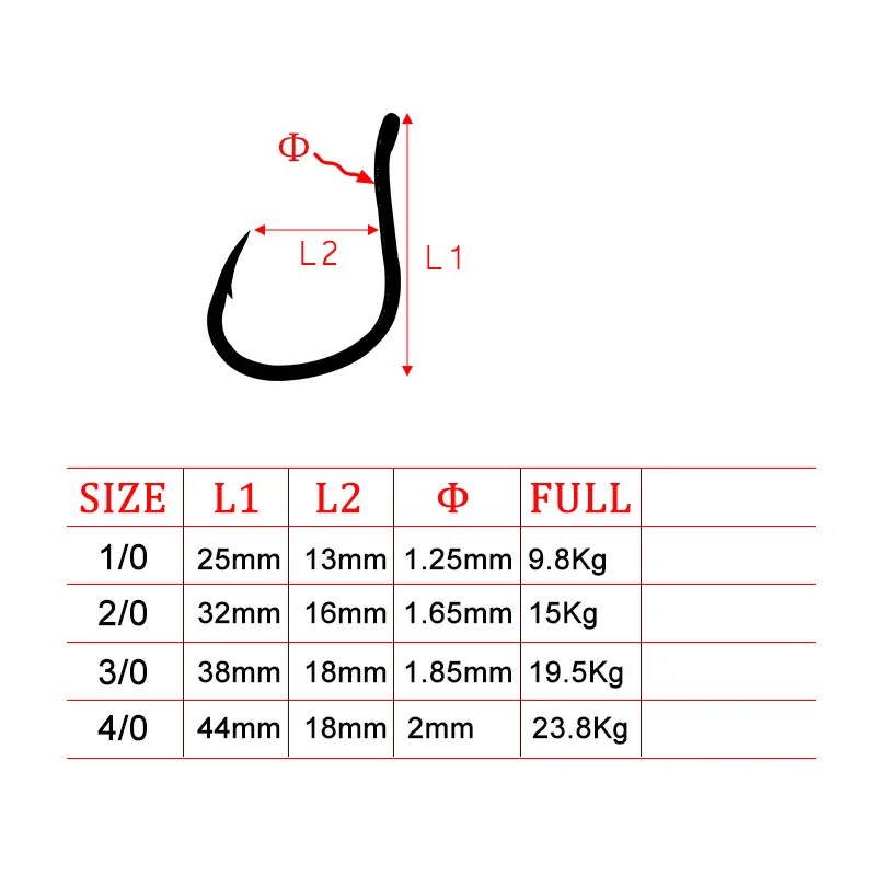 Descripción del anzueloCatálogo de tallas: 1/0.2/0.3/0.4/0.