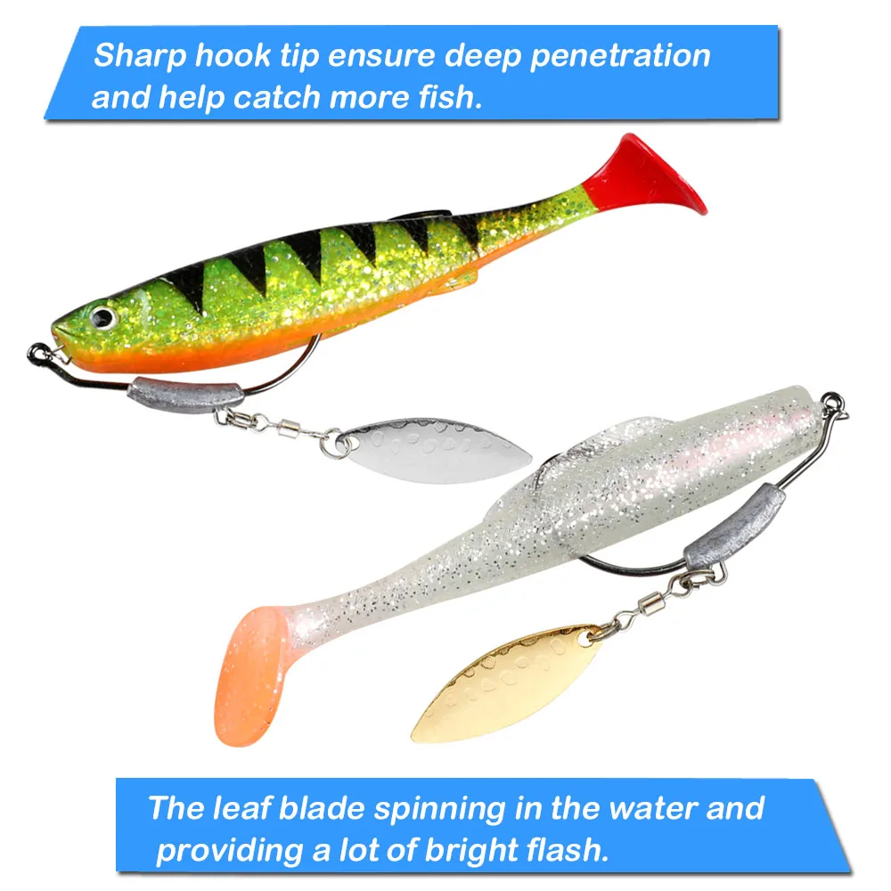 *Los anzuelos Swimbait se especializan en el aparejo de cebos de plástico blando, entre otras, gusanos, cejas, cebos de criaturas, lagartos, cebos de tubo, cebos estilo rana e imitadores de peces cebo.
