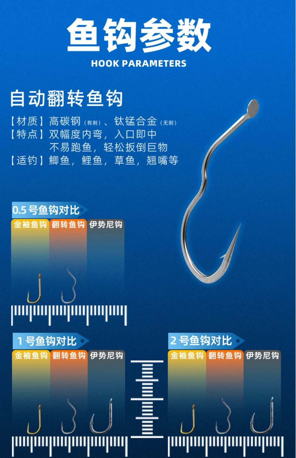Los peces tienen la costumbre de tragar y escupir repetidamente los anzuelos para probar el peligro, y la presente invención está desarrollada para peces a los que les gusta escupir anzuelos. Esquinas redondeadas de doble ancho, entrada de anzuelo plana, el anzuelo se voltea automáticamente cuando el pez se cierra y abre la boca, de modo que la punta del anzuelo puede penetrar en la boca del pez, realizando así el apuñalamiento automático de peces