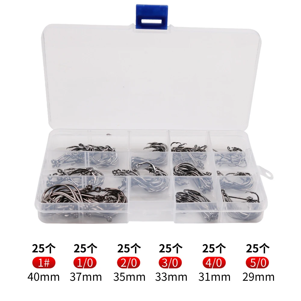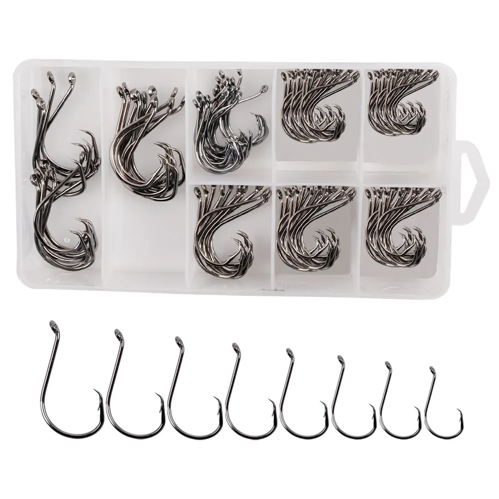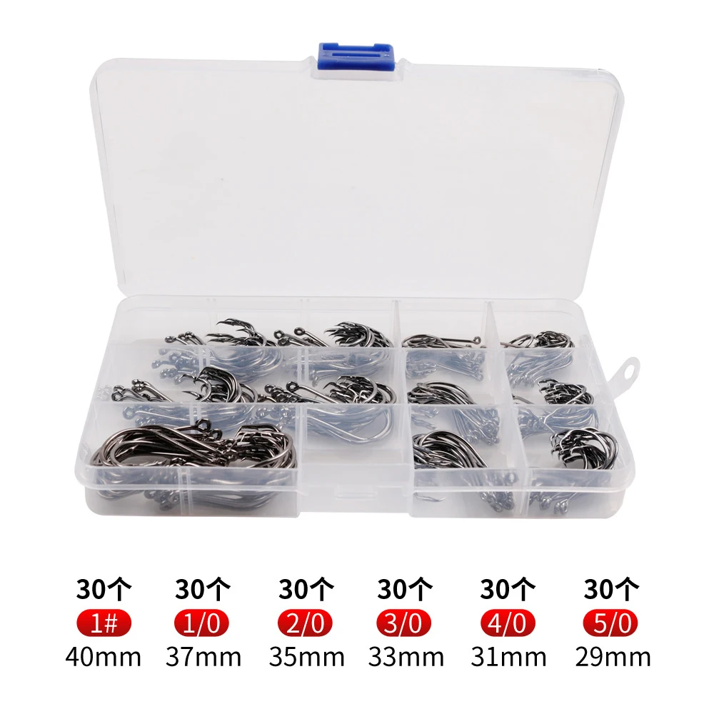 Anzuelo de pesca de acero con alto contenido de carbono, gancho de pesca de caña larga con púas redondas, gancho de junta curvada, anillo de ojo grande, gancho de gusano, señuelo de pesca, cuchara giratoria, 150 piezas