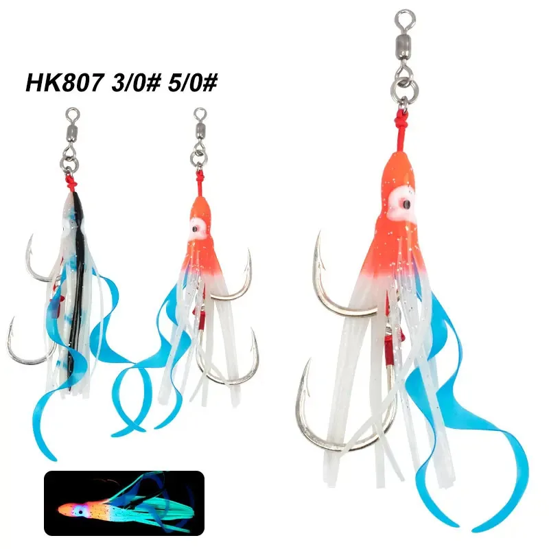 Anzuelo de pesca de agua salada, accesorio giratorio de acero de alto carbono con brillo UV, falda de calamar y pulpo, 3/0, 5/0