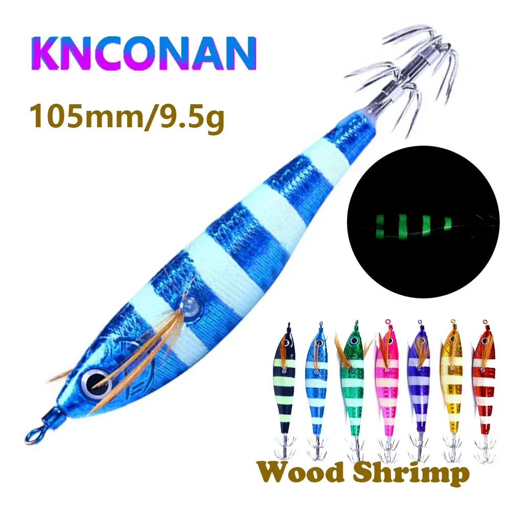 Anzuelo de pesca con anzuelo de calamar luminoso, 10,5 cm, 9,5g, señuelos artificiales de pulpo falso, camarones de madera, sepia, cebo duro, aparejos de plantillas de mar