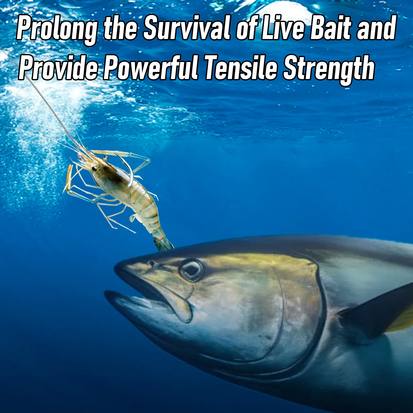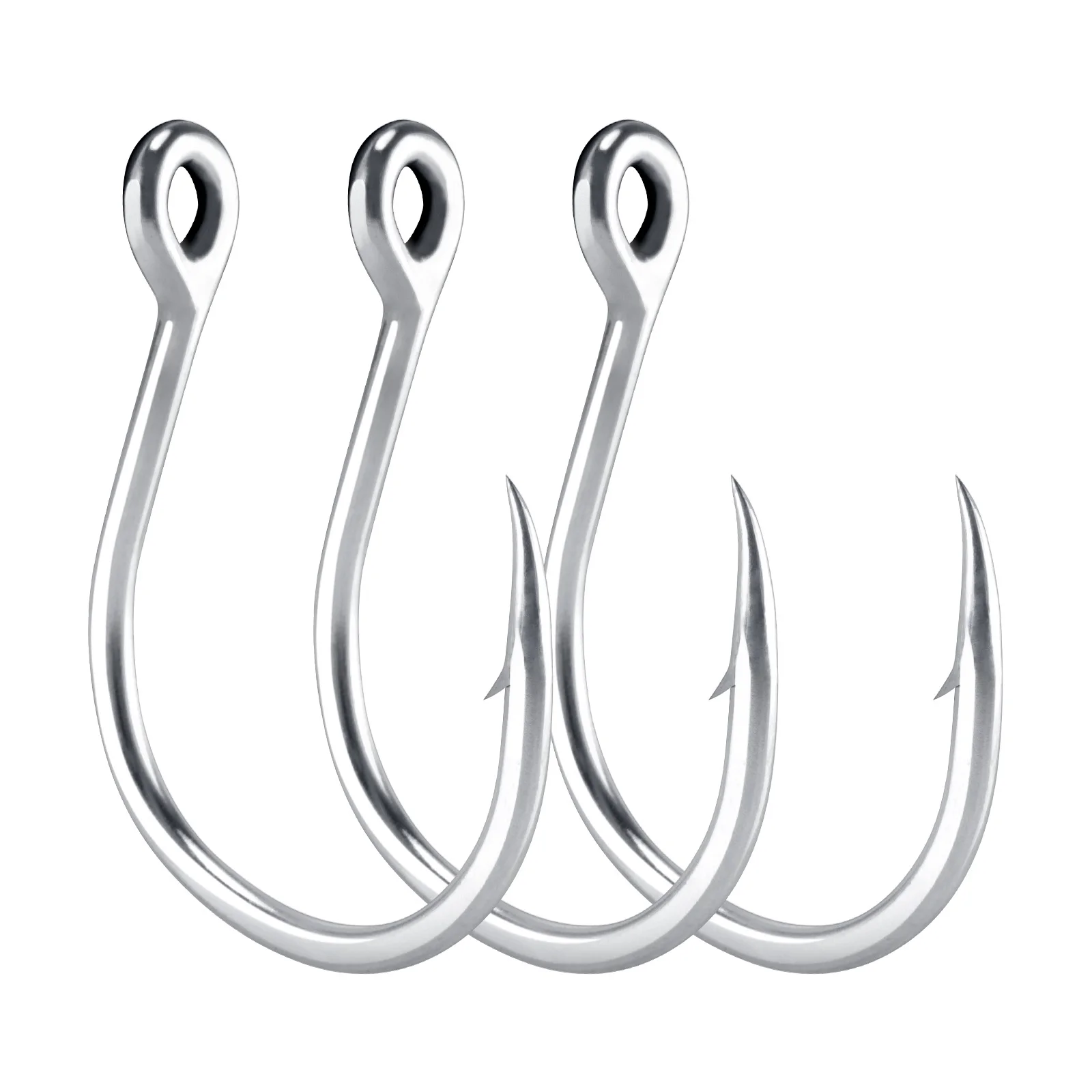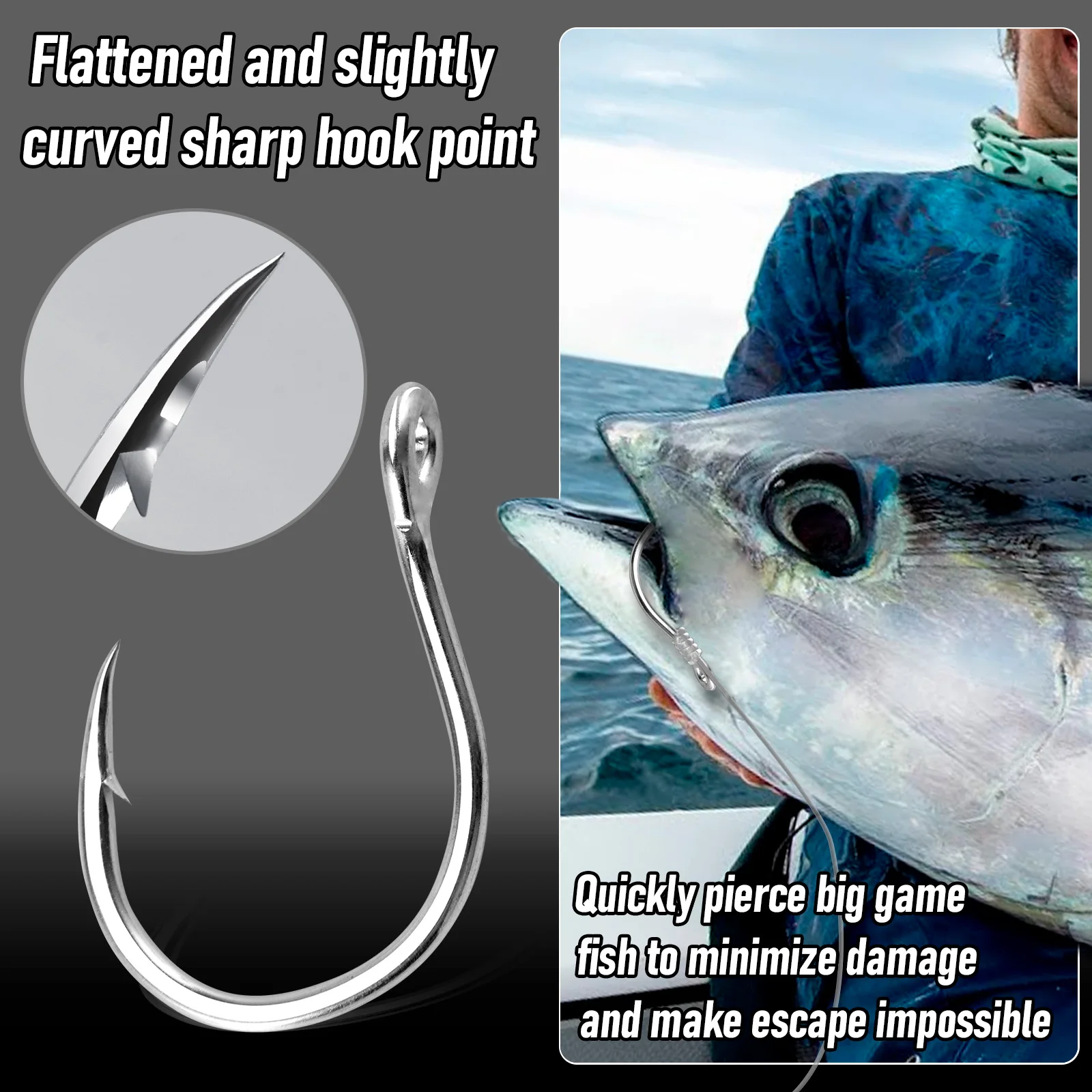 DISEÑO ÚNICO: El Ojo de gancho cerrado soldado garantiza que no se deforme ni se abra cuando se someta a grandes fuerzas. La Punta de anzuelo afilada aplanada y ligeramente curvada perfora rápidamente a los peces grandes y al cebo vivo, minimizando el daño a los peces e imposibilitando que escapen, así como prolongando la supervivencia del cebo vivo.