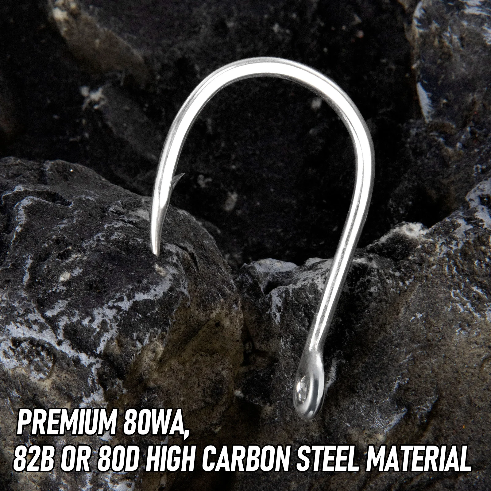 MATERIAL PREMIUM: diferentes lotes de anzuelos de pesca están hechos con el mismo acero de alto carbono 80WA, 82B o 80D potente y efectivo, que posee una resistencia, dureza, resistencia a la corrosión y calidad más ligera.