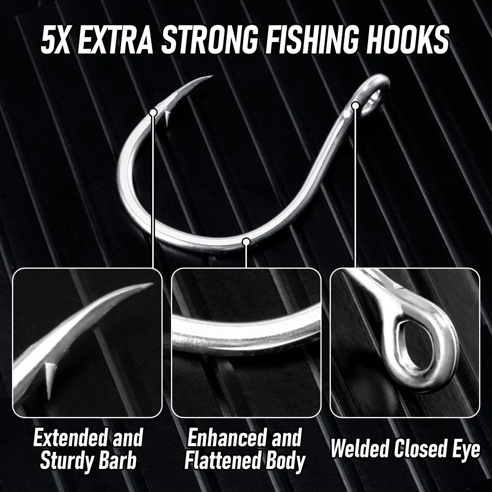 TECNOLOGÍA AVANZADA: Nuestros anzuelos de pesca de resistencia 5X se fabrican con hornos de vacío avanzados con un control preciso de la temperatura de 0,1 grados Celsius, lo que garantiza su resistencia y capacidad para soportar enormes fuerzas de tracción.