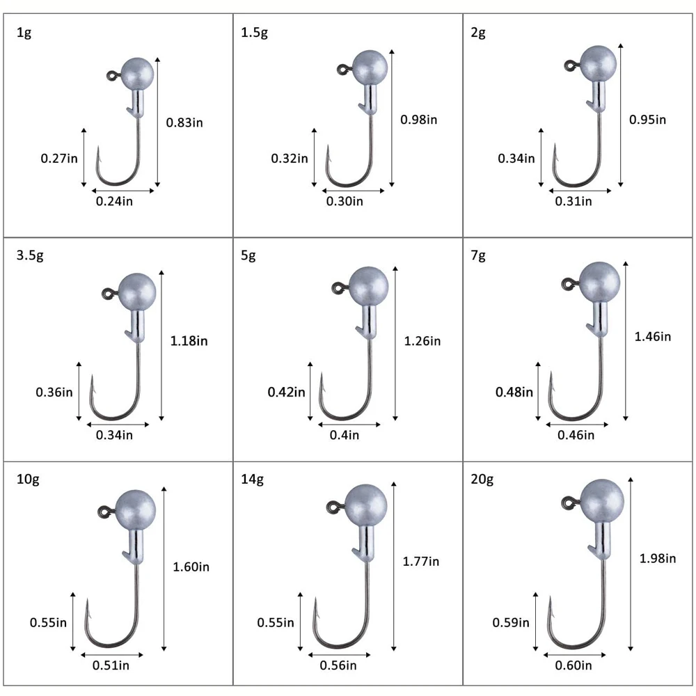 1g -50 Uds.1,5 g -50 piezas2g -50 Uds.3,5 g -50 piezas5g -50 Uds.7g -50 Uds.10 g -40 piezas14 g -30 piezas20g -20 piezasEmbalaje: ganchos de plantilla + bonita caja de plástico.