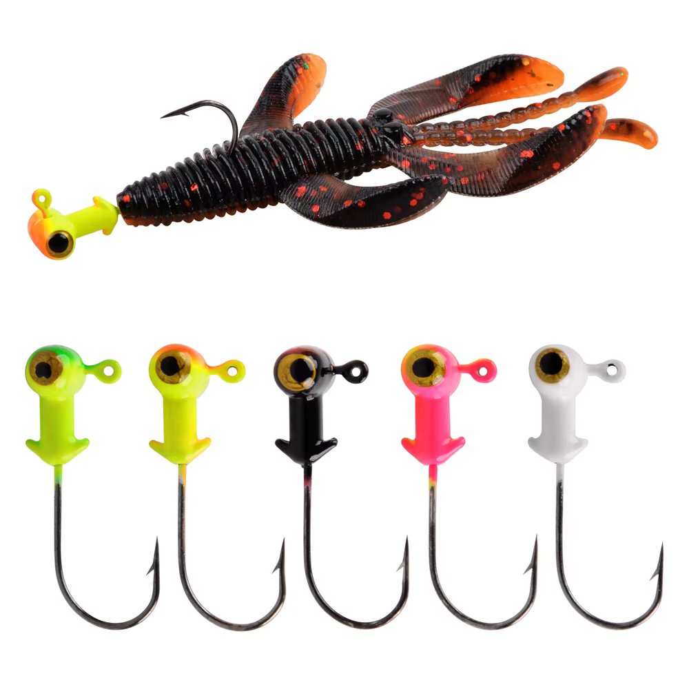 1.The lifelike jig head hook has 3D eyes,reflect light and add additional visual effects. A good fishing gift for anglers!