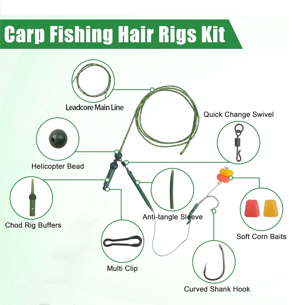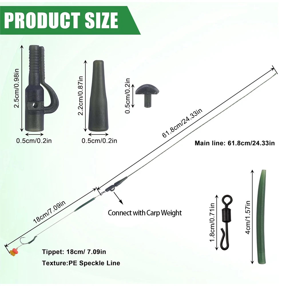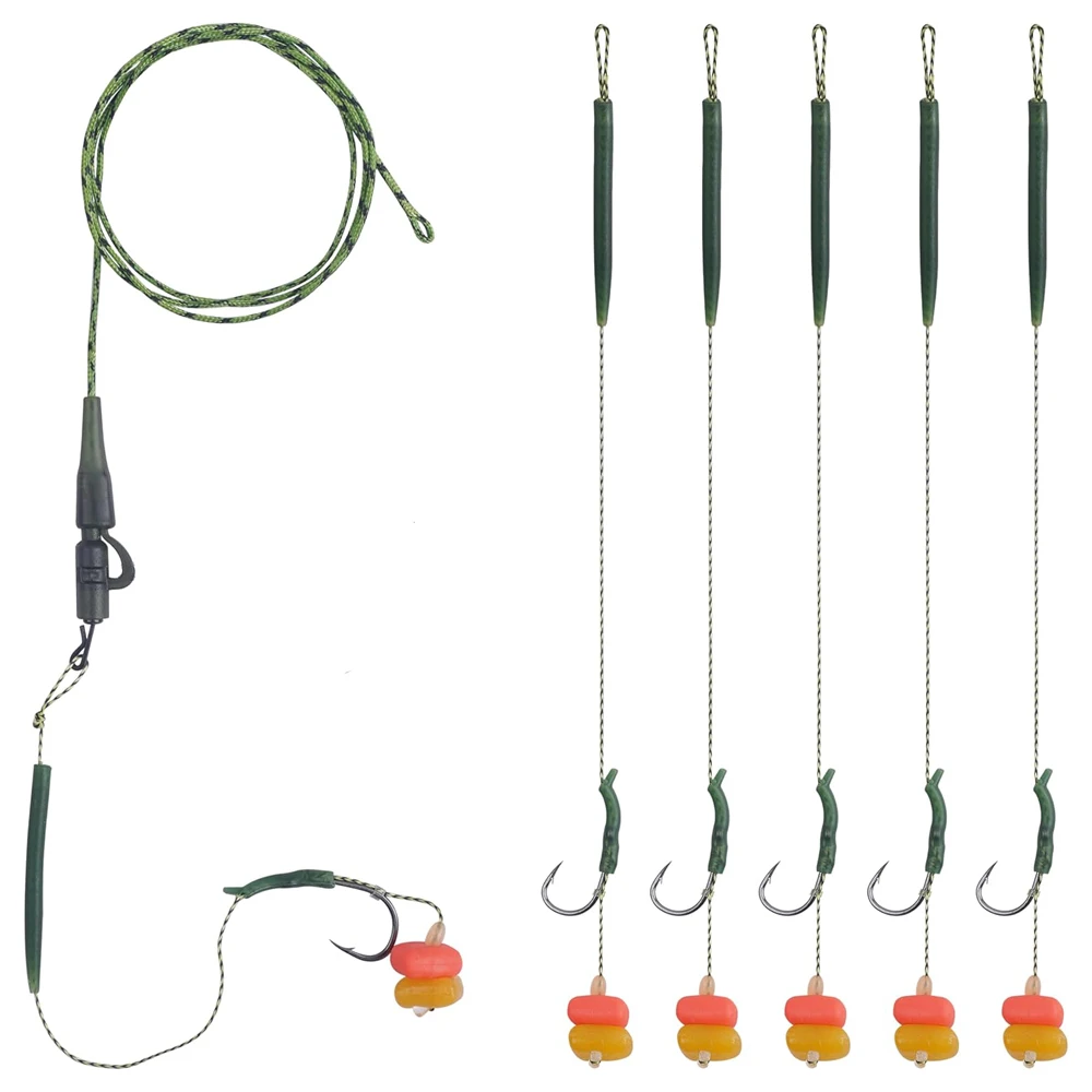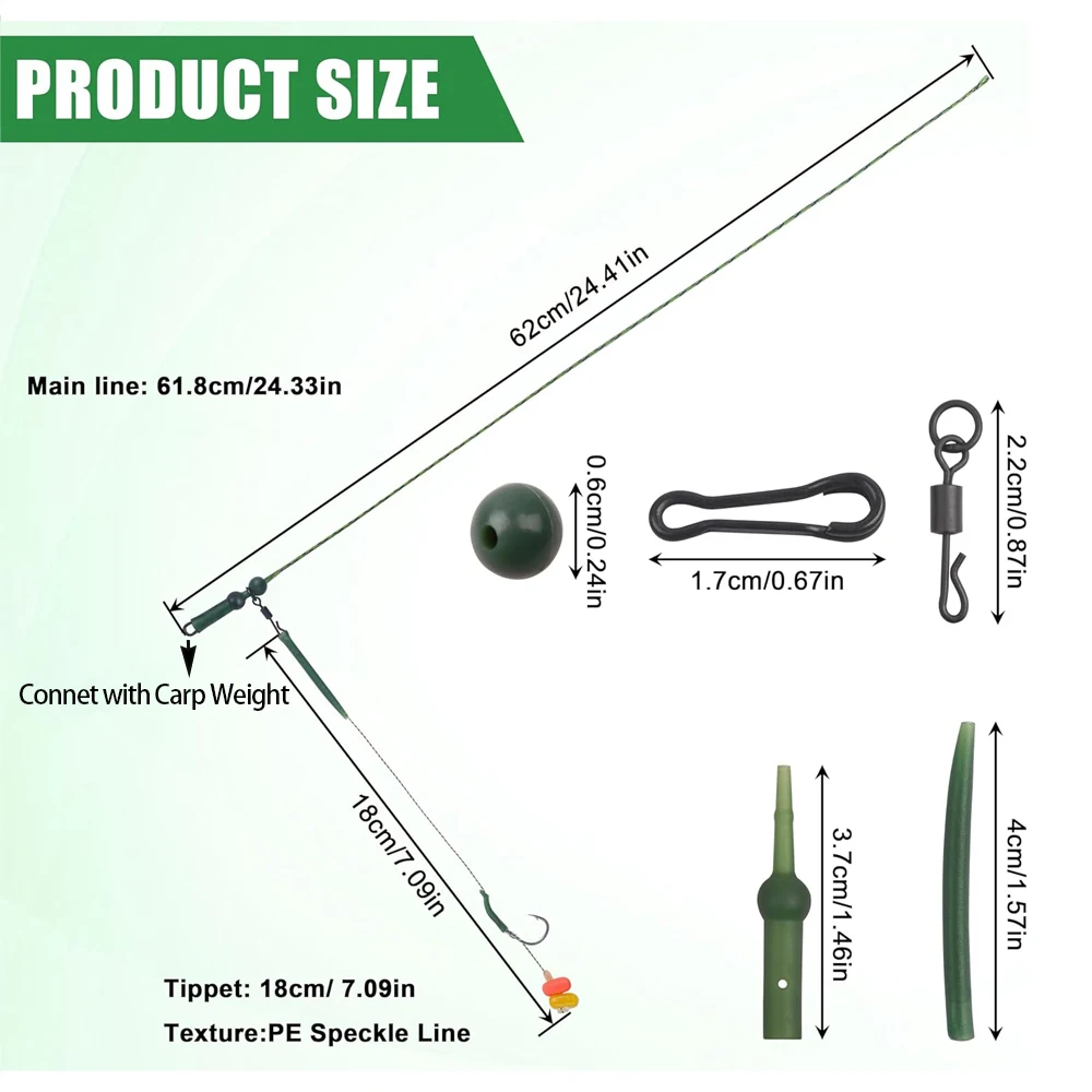 1.El kit de aparejos de pesca de carpa contiene 1 juego de aparejos de pesca de carpa preequipados y 5 aparejos de línea líder adicionales.Listo para usar para una configuración rápida y funciona muy bien. Puede comenzar a pescar de carpa de inmediato.