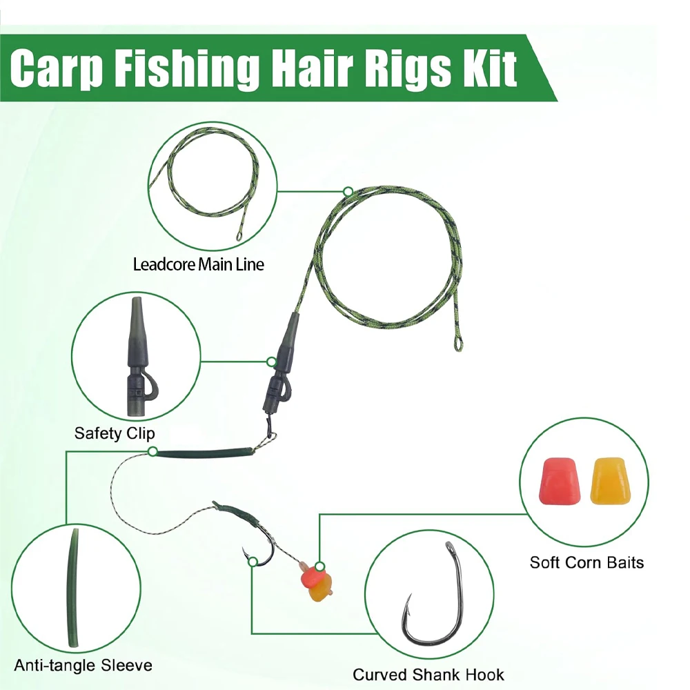 2.Equipos para el cabello de pesca de carpa con línea líder Leadcore, longitud: 7,1 pulgadas, prueba: 15 lb-45 lb, duraderos y resistentes en capacidad de carga.Línea líder atada con cebos de maíz, clip de seguridad y giro de cambio rápido para reducir el enredo al mínimo.