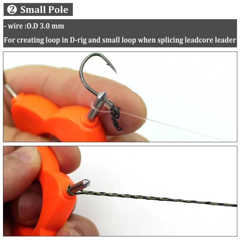 2 "poste" (pequeño, cable: O.D 3,0mm): para crear bucles en el aparejo D y bucle pequeño al empalmar el líder del núcleo de plomo.
