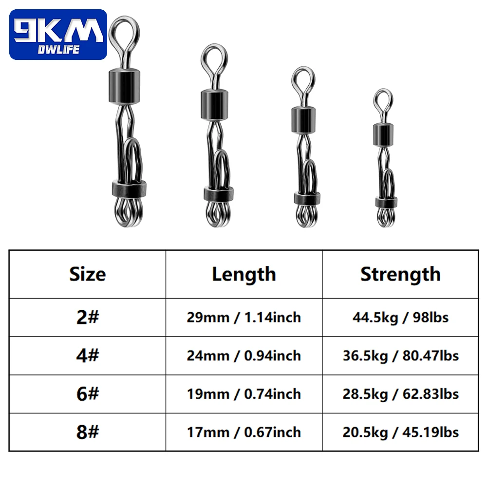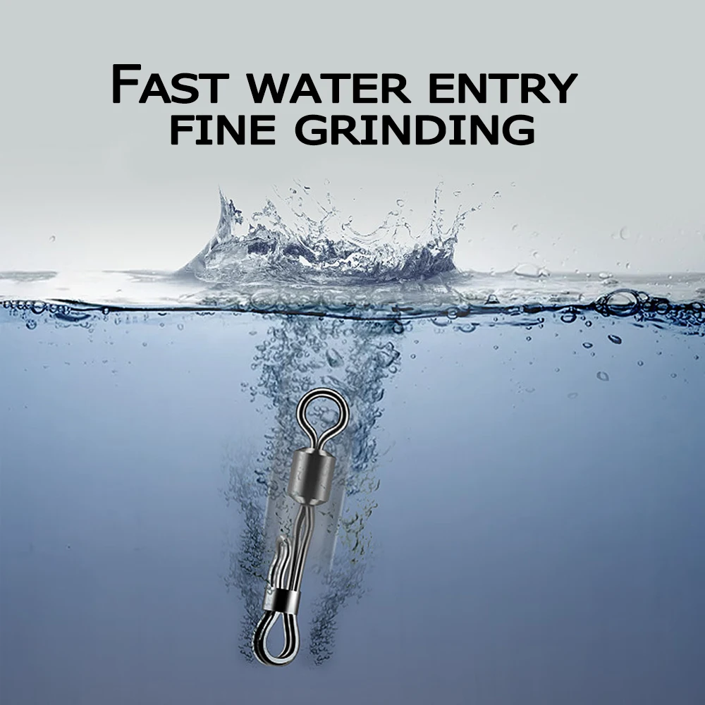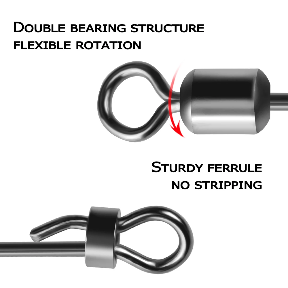 2.Rotación de alta velocidad:Ambos extremos del pivote pueden funcionar 360° rotación de alta velocidad, lo que reduce el riesgo de torsión del cable, ya que el cable trenzado se debilitará y eventualmente se romperá.Aumentando así la vida útil de tu hilo de pescar.