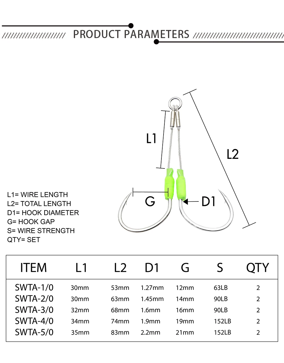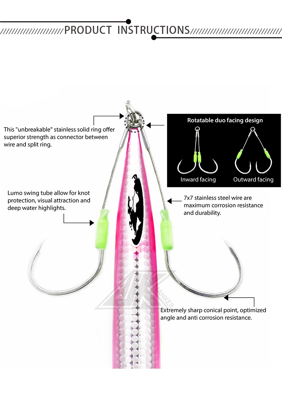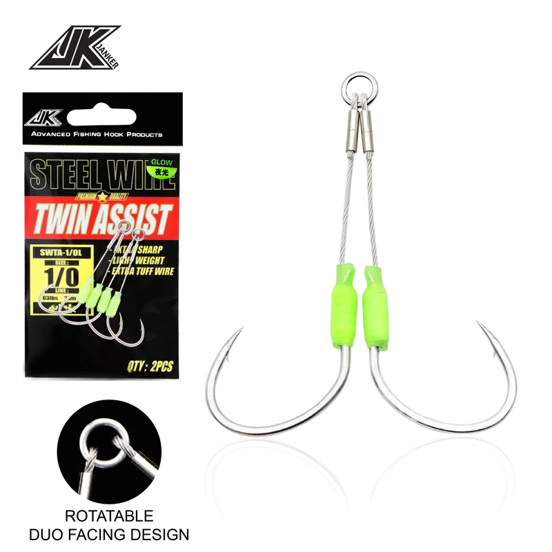 Descripción de SWTA:El Janker Steel Wire Assist(SWTA) se especializa en peces con dientes afilados como la caballa, wahoo y hairtail que utiliza un alambre que no tiene que cortarse en dientes afilados y ajusta el gancho a un escalón. Es un anzuelo de asistencia solo para topografía que organiza el tubo luminoso en los ojos del anzuelo, atrapa eficazmente la picadura de los peces en el barco disfrutando tanto de la pesca numérica como de la puntería grande.