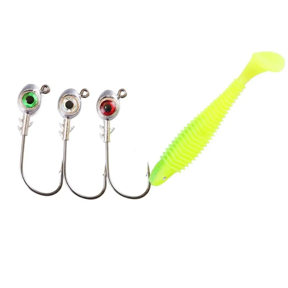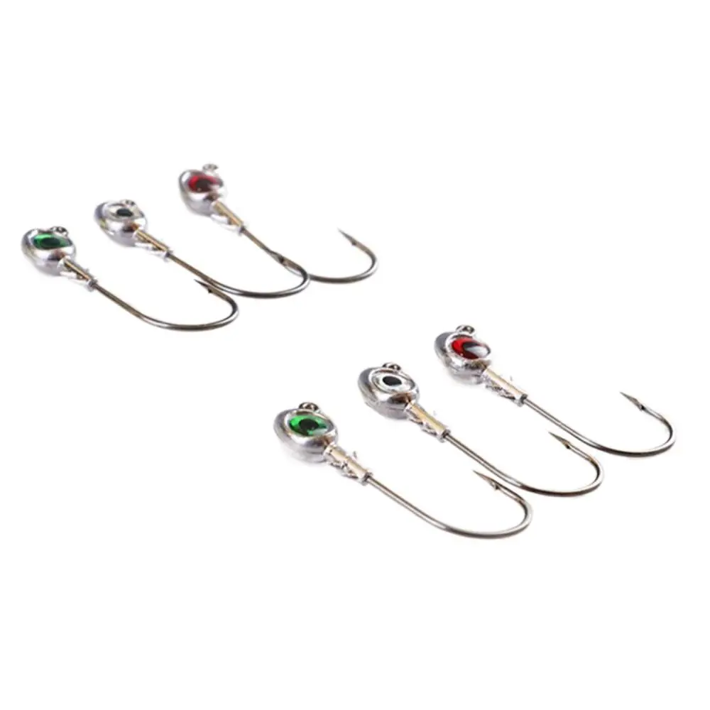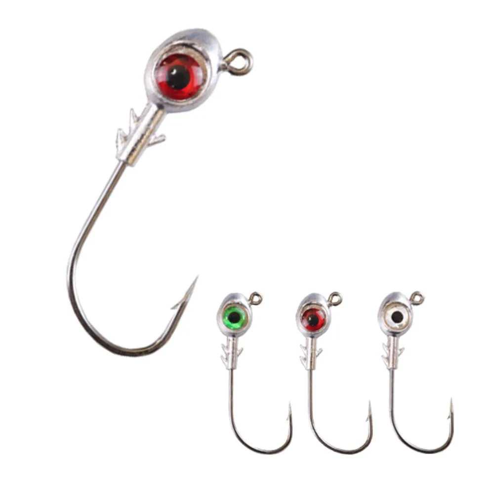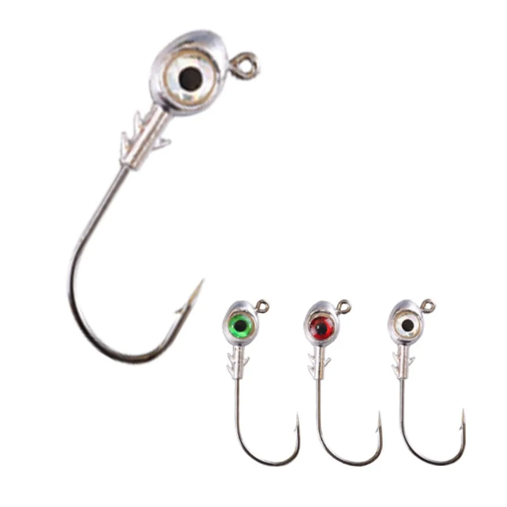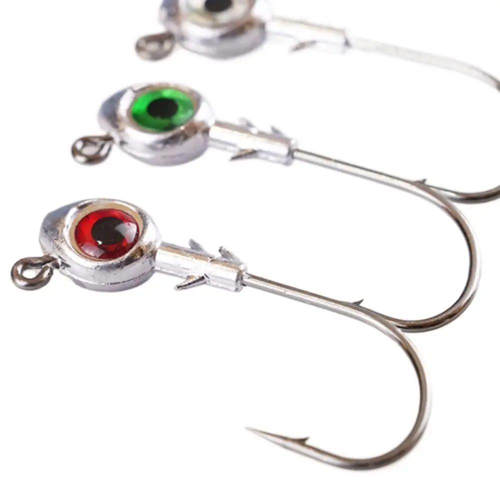 3. Fácil de instalar sus cebos vivos o plástico. Haz que tu plástico suave parezca una presa viva. El cabezal de ojo tiene tres púas que pueden sujetar el plástico de forma segura.