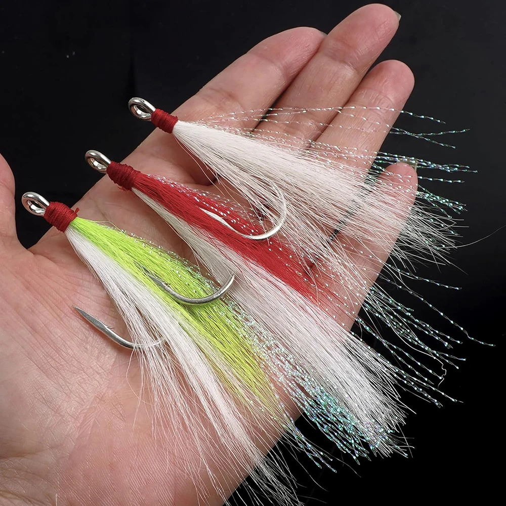 Cantidad: 2PCS Color: rosa, blanco, rojo, verde Material: acero inoxidable Modelo: Anzuelos de pesca Bucktail Característica detallada: 1.Los anzuelos de pesca de teaser de agua salada con jigs de bucktail cuentan con cola de bucktail/cola de cristal atada a mano con colores brillantes, lo que agrega un destello y movimiento que atrae a los peces a los aparejos de agua salada, aumentando sus posibilidades de lograr una captura exitosa.2.Los anzuelos Bucktail fabricados en acero inoxidable resistente ofrecen resistencia y durabilidad excepcionales.Su construcción garantiza que pueda soportar condiciones difíciles de pesca en agua salada y proporcionar una mayor relación de enganche.3.Los anzuelos de pesca Teaser están disponibles en 4 colores brillantes diferentes, el verde blanco funciona mejor en aguas claras, especialmente en días soleados;Rojo es una excelente opción inicial cuando el agua es turpitosa debido a su alta visibilidad;El rosa funciona muy bien cuando los aparejos de planto para agua salada se alimentan en calamares locales o camarones de mantis.4.Anzuelos de plumas Bucktail Teaser, ideales tanto para pesca costera, alta mar, en roca como en surf.Coge flounder, stripers, pargo, lubina, etc., pesca.
