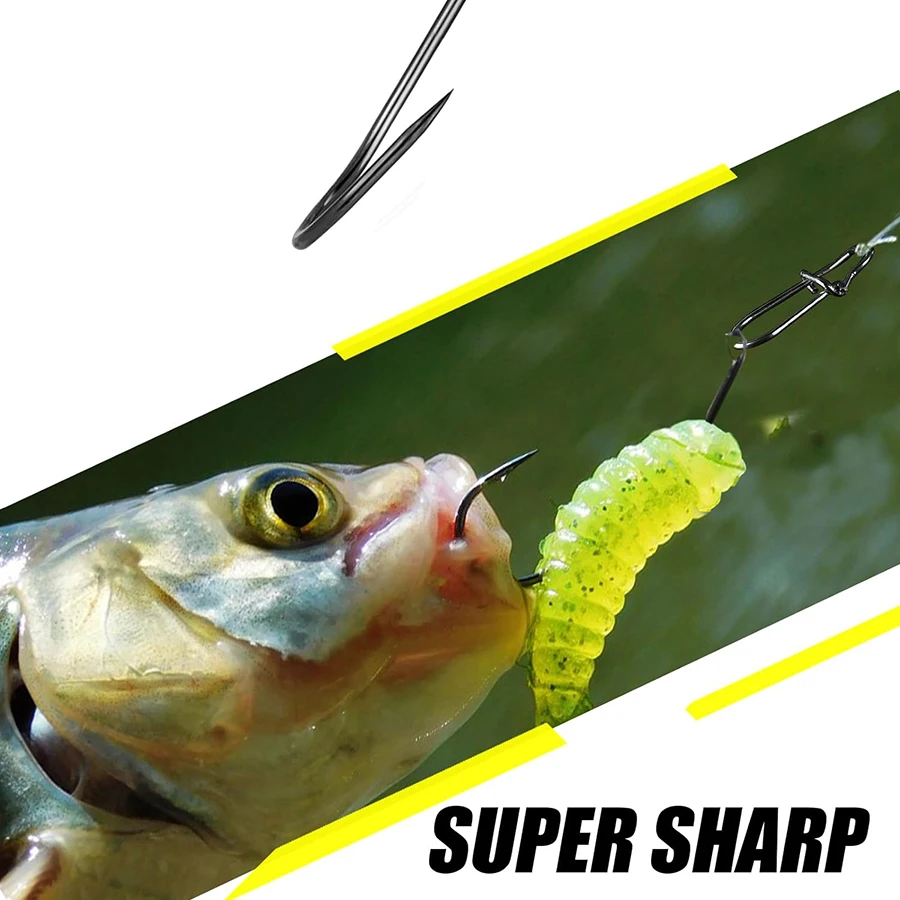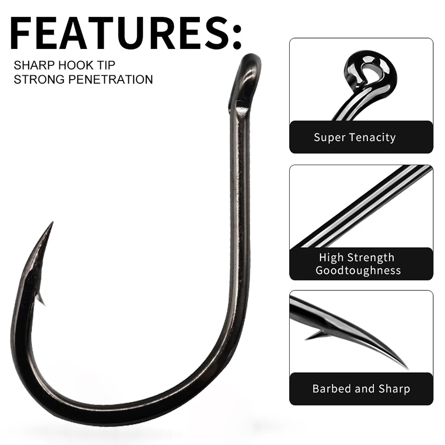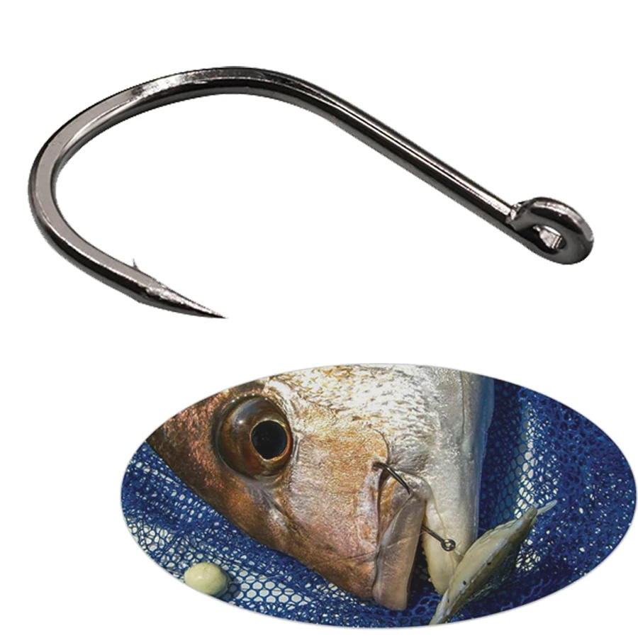 Amplias aplicaciones de diseño de puntos desplazados: Esto será útil para sus diversas necesidades.El tamaño más pequeño sería ideal para pescar croaker o alfinete para cebo y el más grande sería bueno para pescar trotas y trotas.El anzuelo de pesca con agua salada es fácil de conectar un señuelo blando. El punto de desplazamiento y la púa especial podrían hacer que la punta ruede en la esquina de la boca del pez y reduzca la mortalidad de los peces.