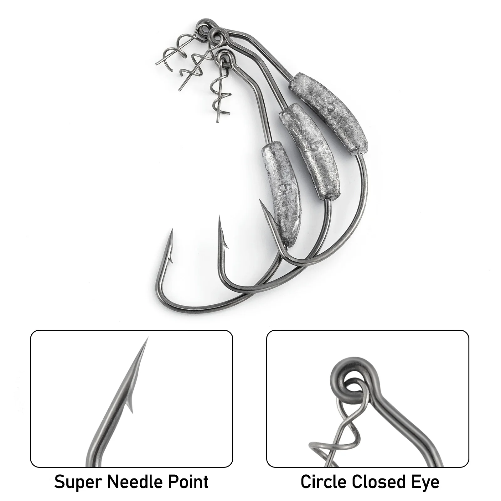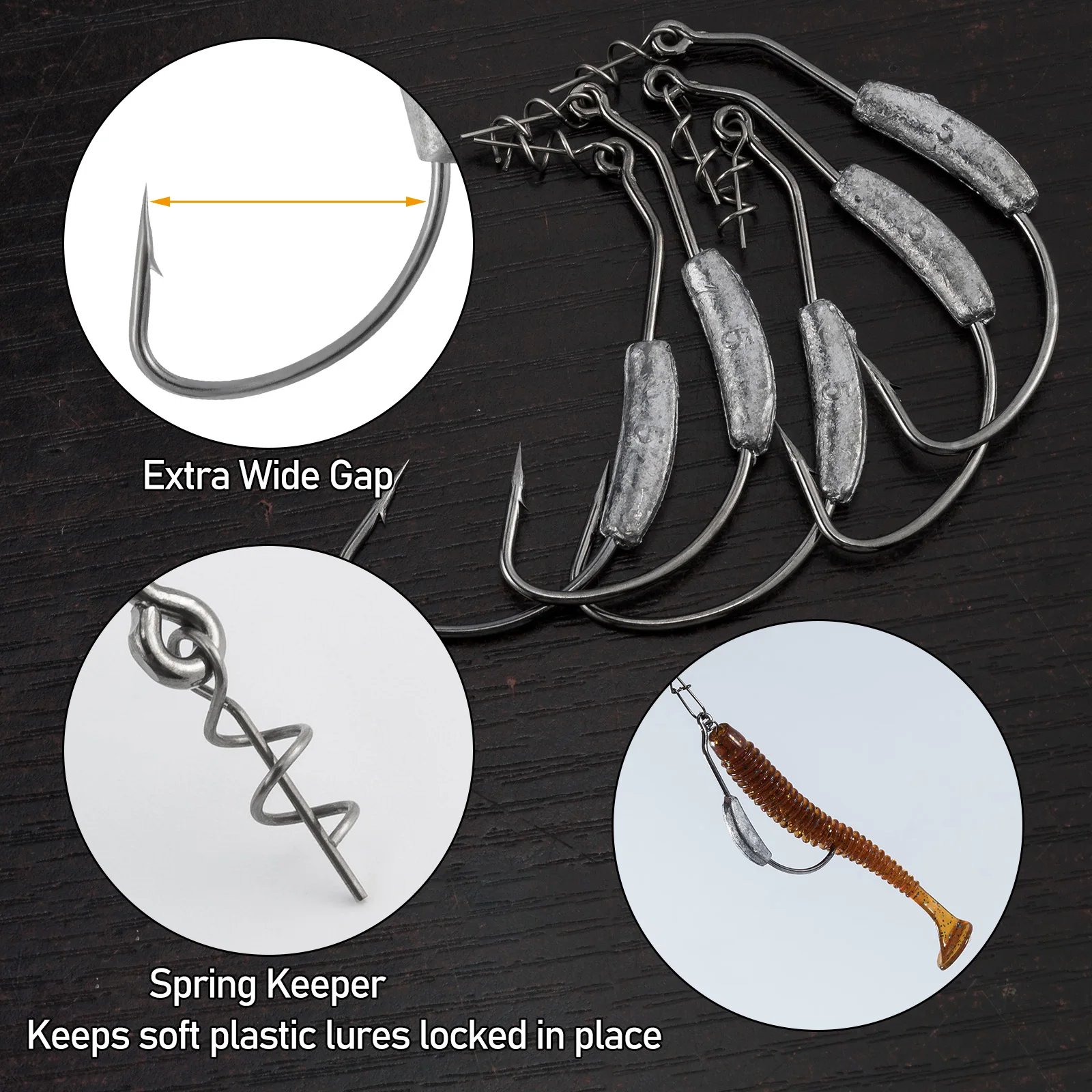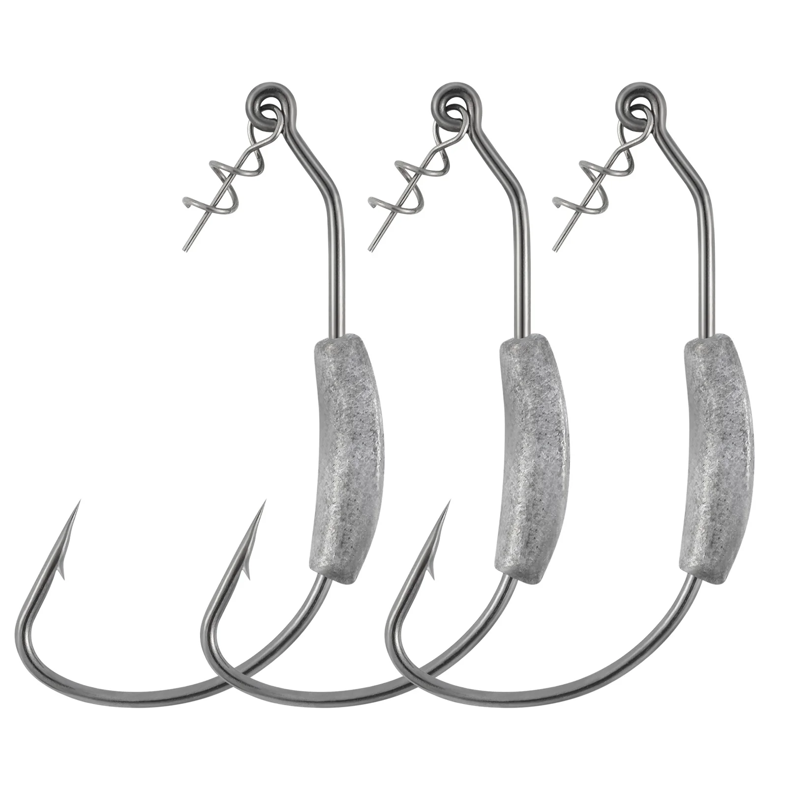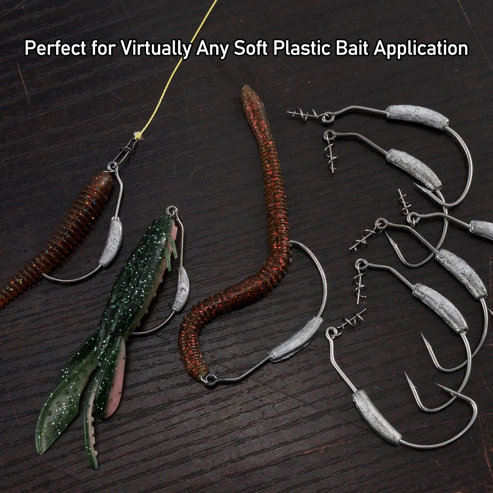 2. Perfecto para cualquier aplicación de cebo de plástico blando: con su curva especial, Estos ganchos de gusano compensados pueden sujetar de forma segura varios tipos de cebos de plástico blando en su lugar, lo que los hace versátiles para diferentes técnicas de pesca.