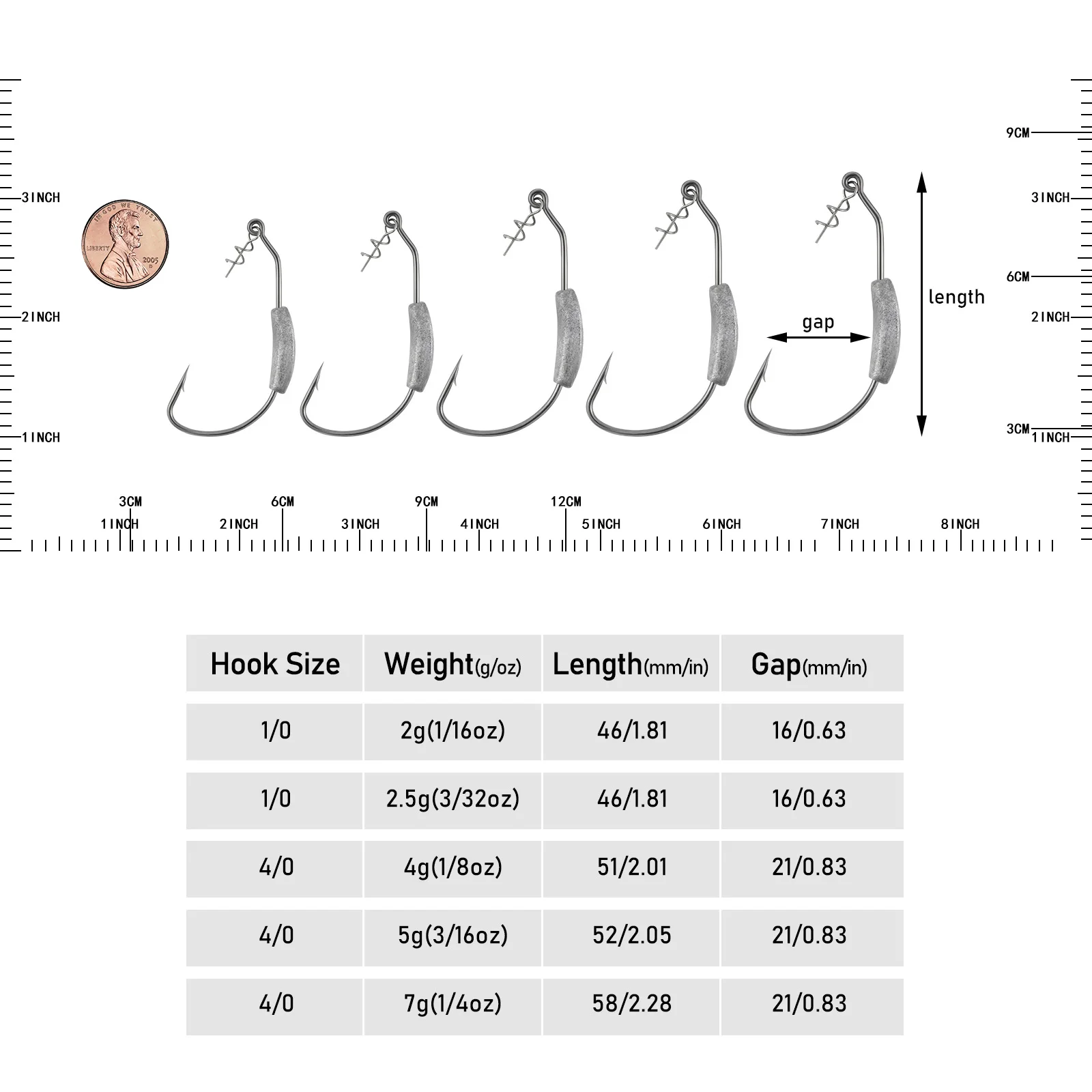 5. Múltiples opciones de peso: Disponible en 1/16oz, 3/32oz, 1/8oz, 3/16oz y 1/4oz, estos anzuelos ofrecen una gama de opciones para satisfacer sus necesidades de pesca. Consulta la tabla de tallas de anzuelo para seleccionar el tamaño perfecto para tu cebo y especie objetivo.