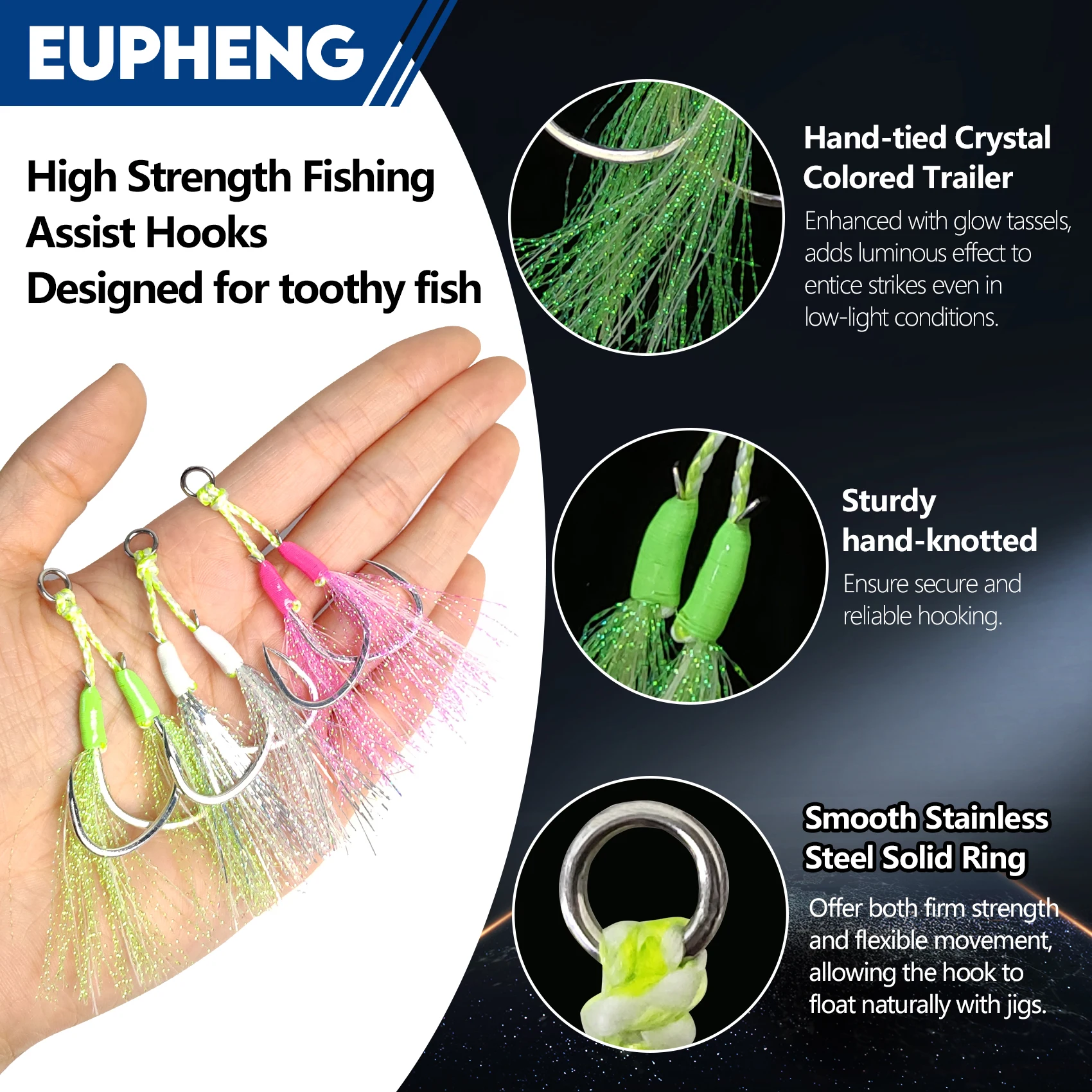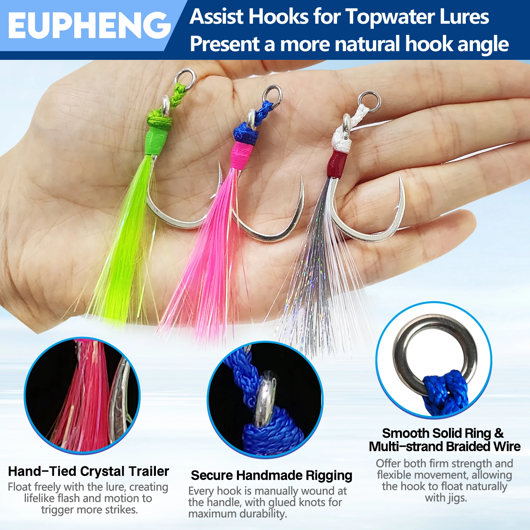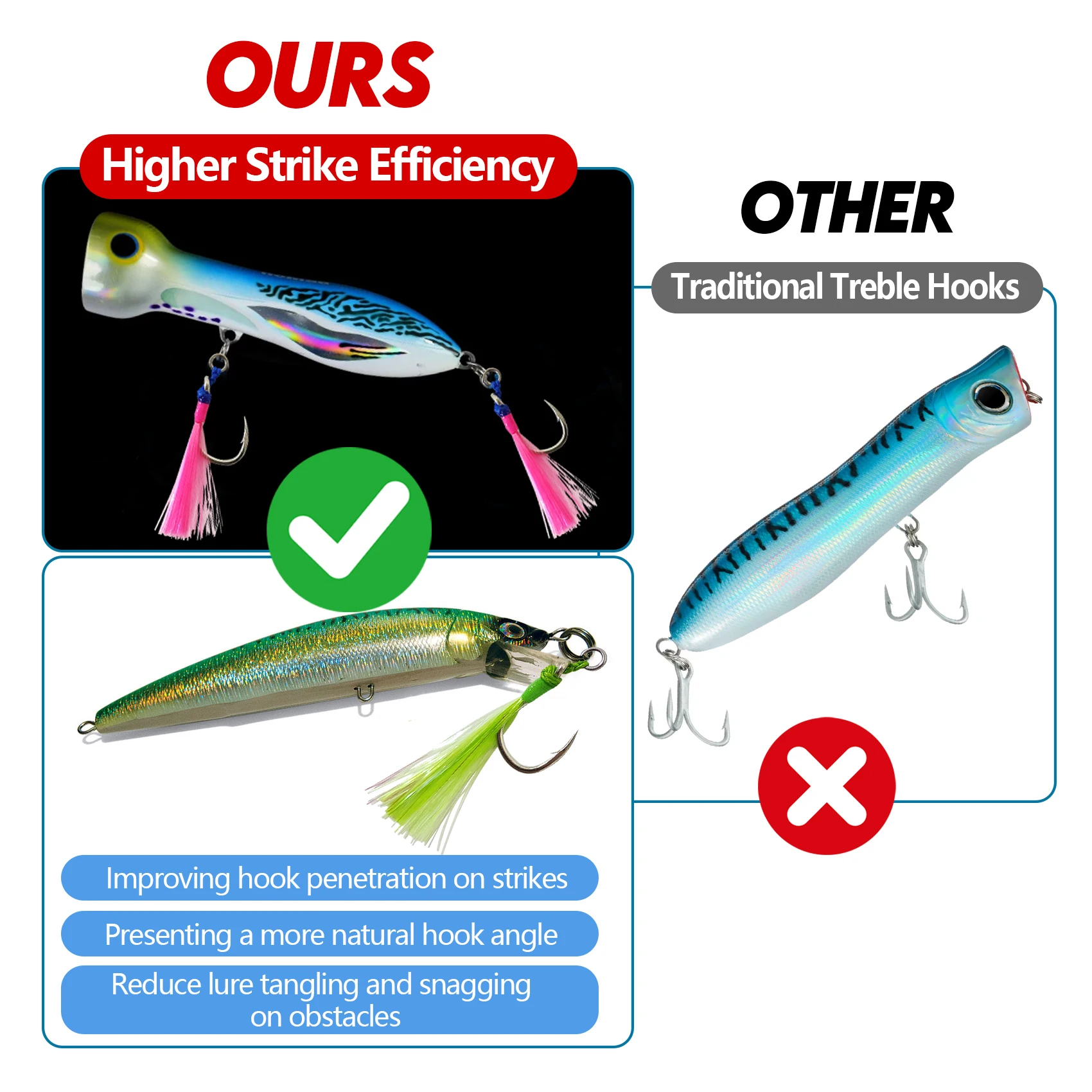 Higher Strike Efficiency vs Traditional Treble Hooks: Eupheng Assist Hooks enhanced hook-up performance on topwater lures by presenting a more natural hook angle. Compared with treble hooks, assist hooks greatly reduce lure tangling and snagging on obstacles, while improving hook penetration on strikes. Allows for deeper, more secure hookups.