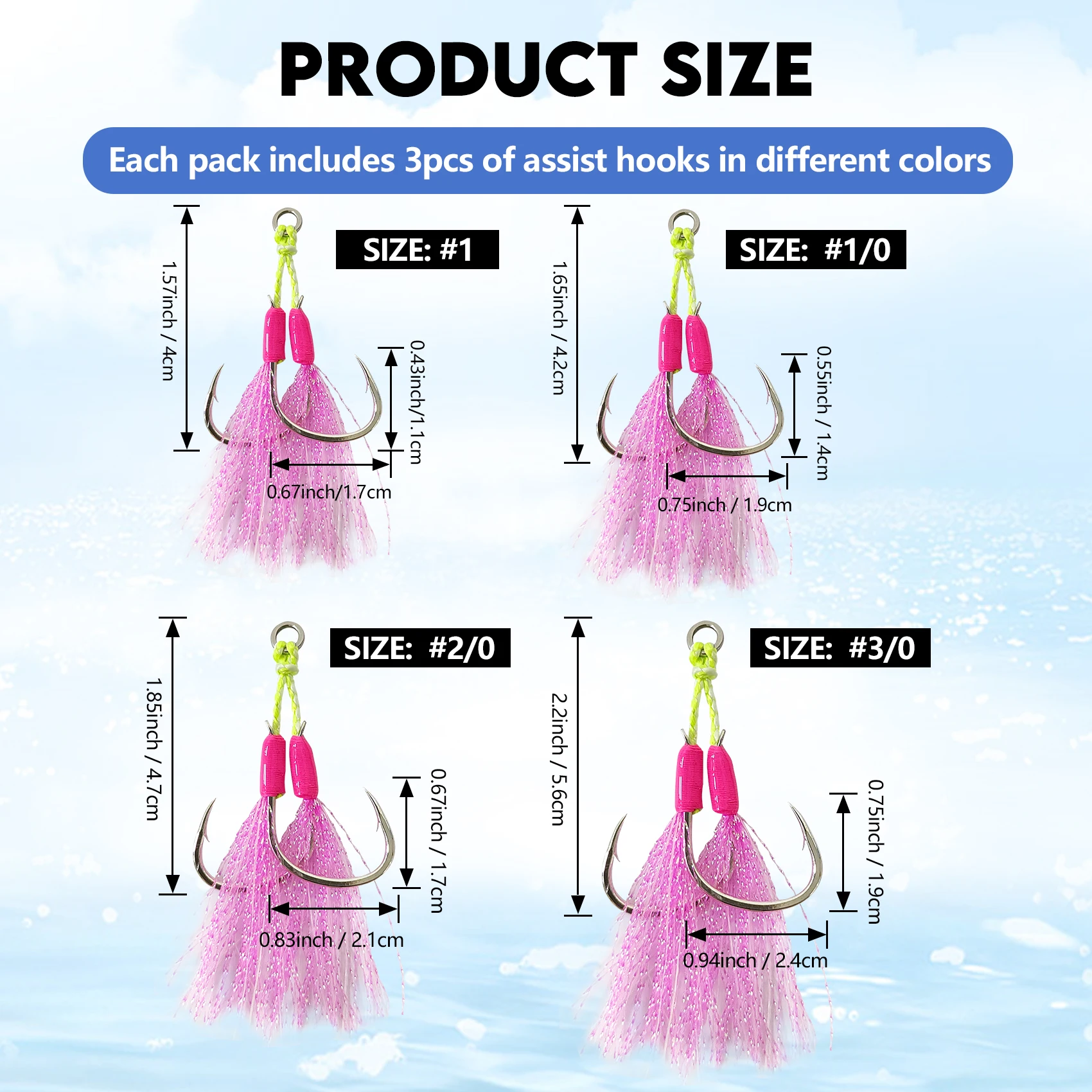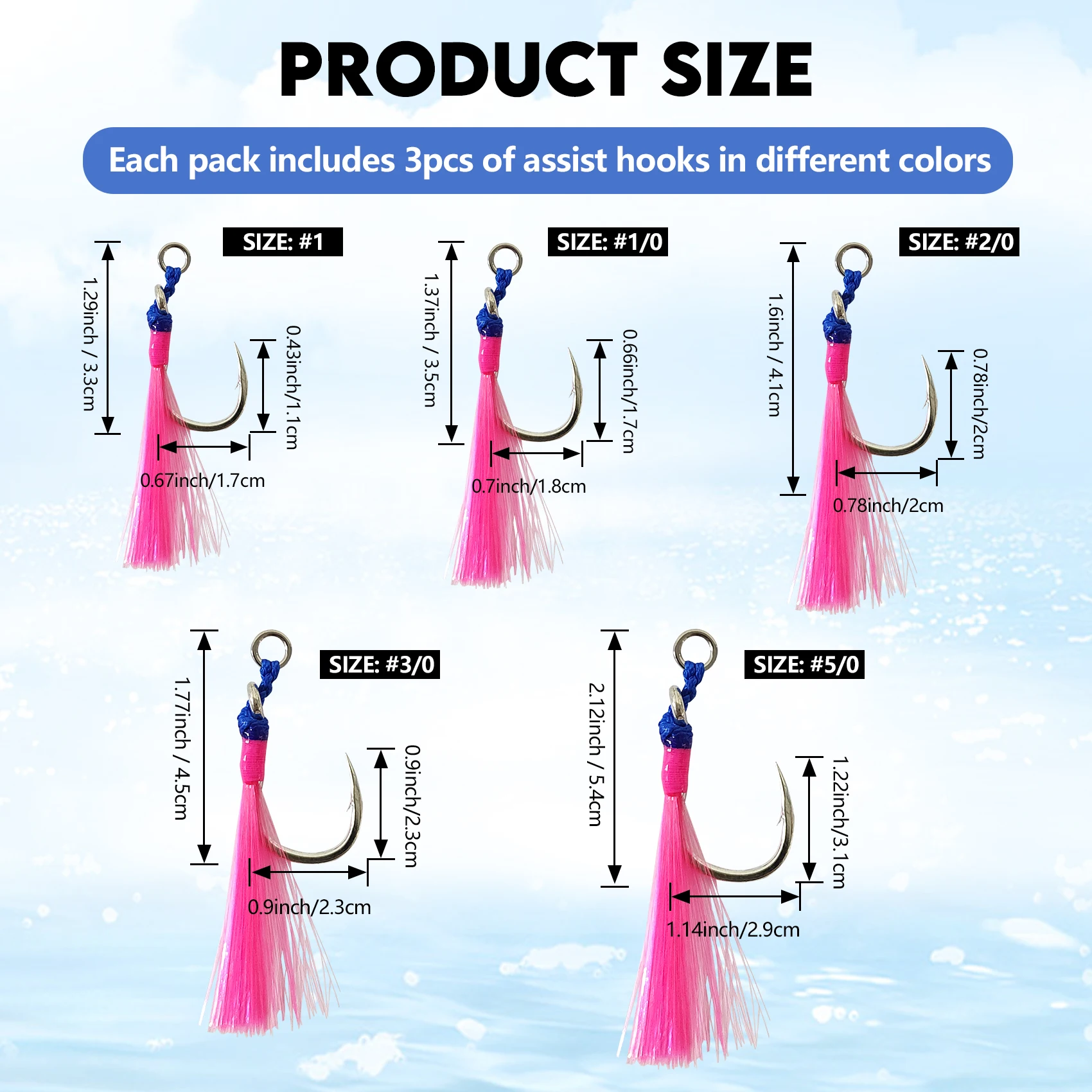 Natural Swimming Action & Multiple Sizes: The smooth solid attachment ring offers both firm strength and flexible movement, allowing the hook to float naturally with jigs. Each pack includes 3pcs of assist hooks, available in four sizes (#1, #1/0, #2/0, #3/0, #5/0) to match different lures and fishing conditions.