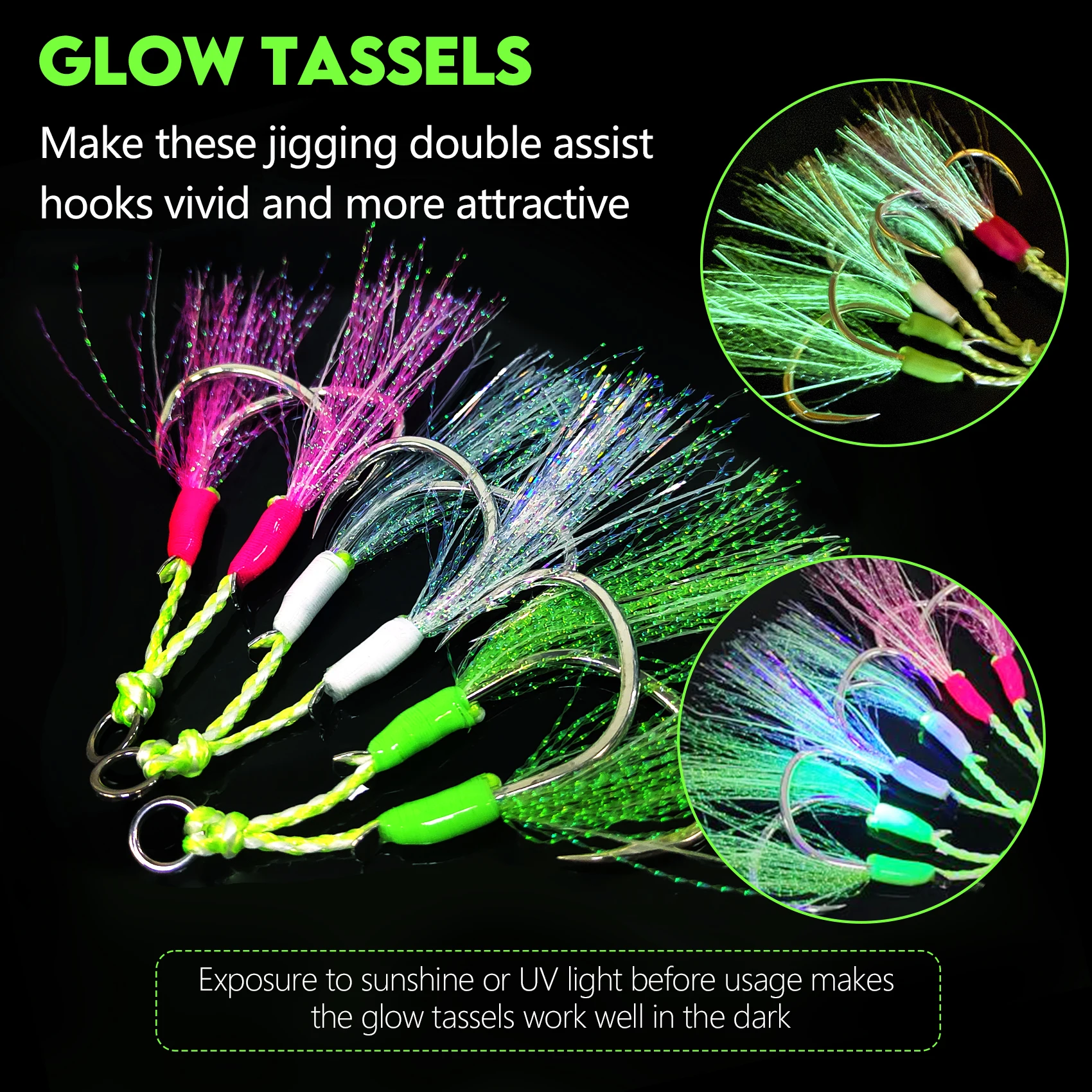 Glow In Dark: The exquisite hand-tied crystal-colored trailer, enhanced with glow tassels, adds luminous effect to entice strikes even in low-light conditions. (Exposure to sunshine or strong light before usage makes the glow tassels work well in the dark)