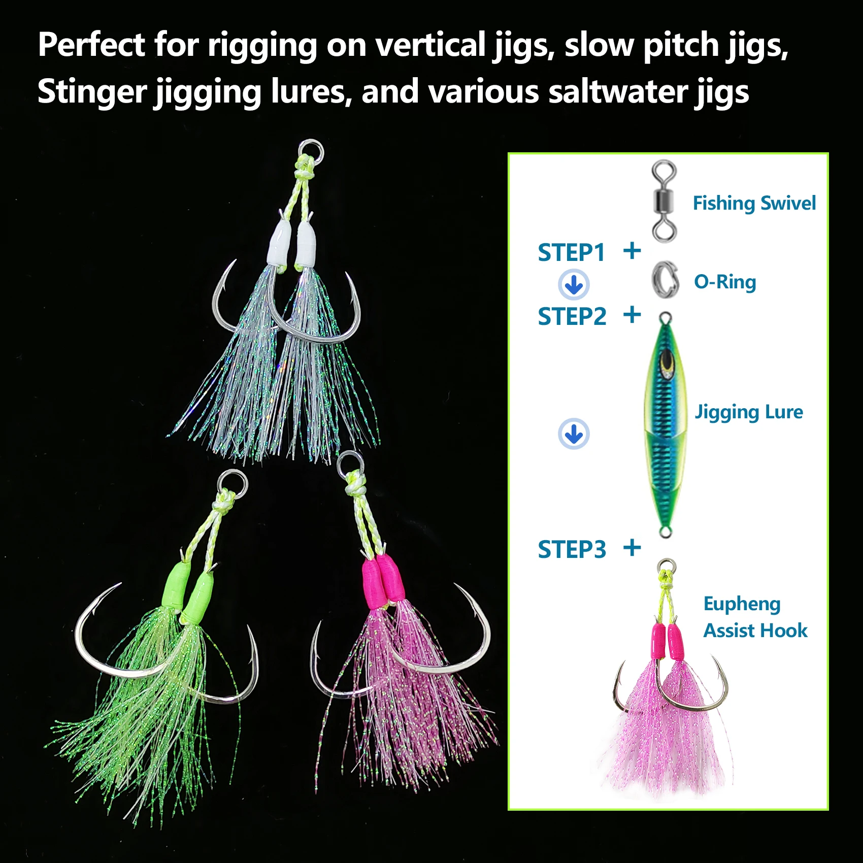 Versatile for Multiple Jigging Styles & Replacements: Perfect for rigging on vertical jigs, slow pitch jigs, Stinger jigging lures, and various saltwater jigs. These assist hooks can also replace treble hooks on baits, reducing snags while improving hook-up efficiency.