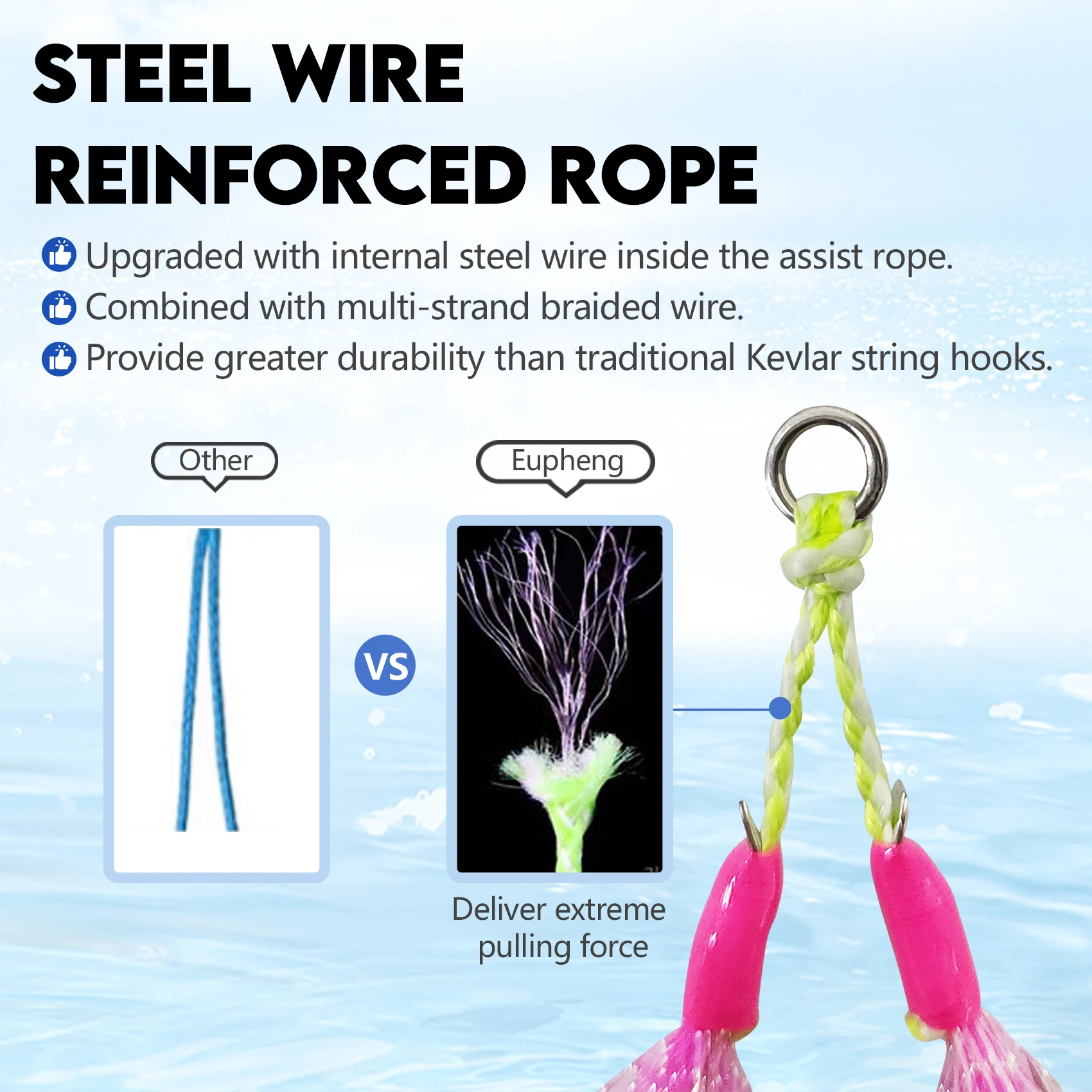 Steel Wire Reinforced Rope: Double Assist Hook Upgraded with internal steel wire inside the assist rope, providing greater durability than traditional Kevlar string hooks. Combined with multi-strand thick braided wire, these assist hooks deliver extreme pulling force.