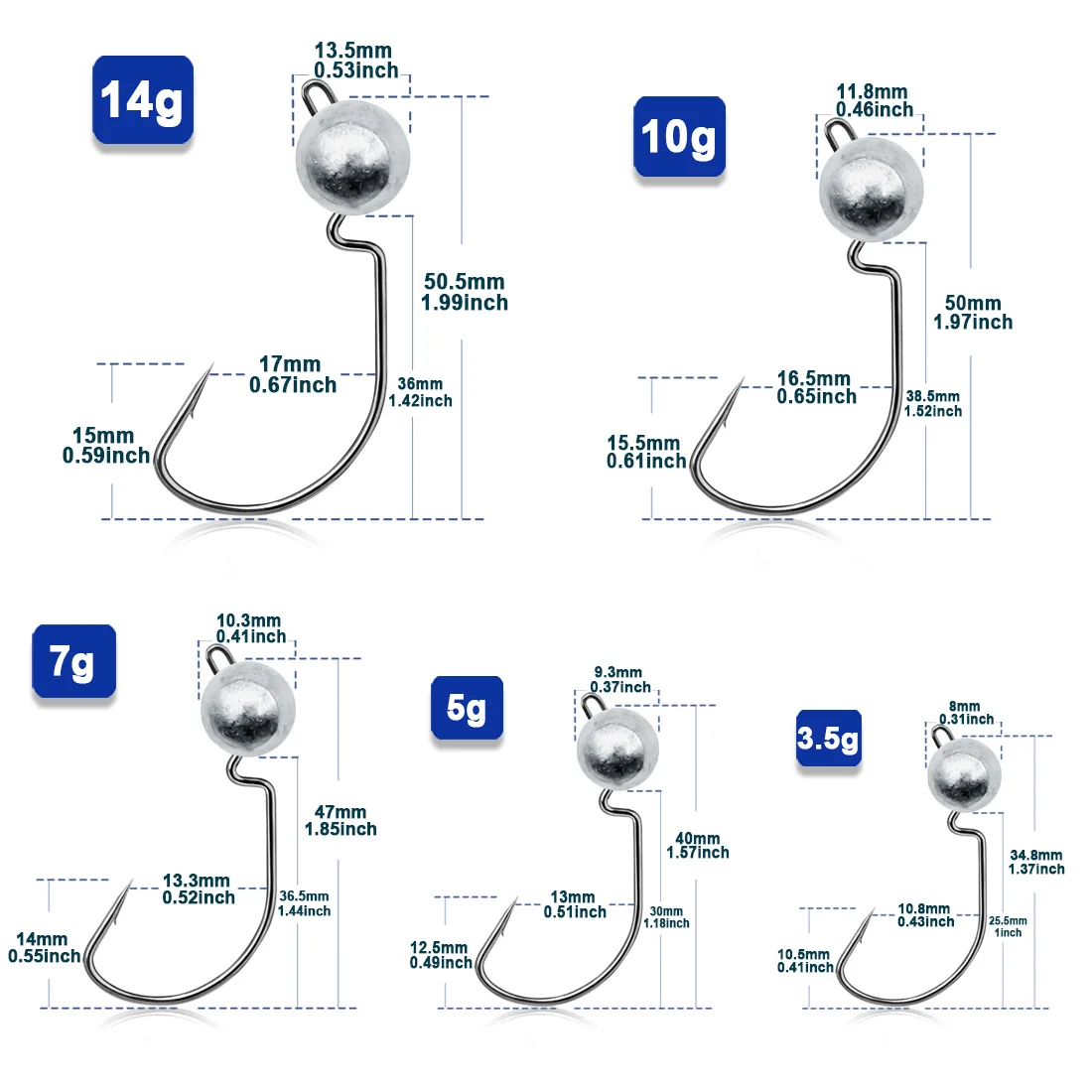Cabeza de plantilla de bola redonda: la parte con forma de bola redonda con ojo resistente puede conectar fácilmente la línea en ella. Este anzuelo de cabeza de plantilla asegurará el peso suficiente para su pesca de tiro directo. Cuando cuelgue, el peso sobre él podría ayudar a deshacerse de la presión hidráulica y recuperar fácilmente los peces.