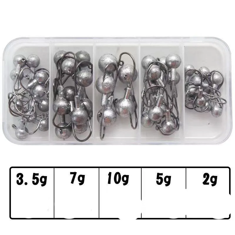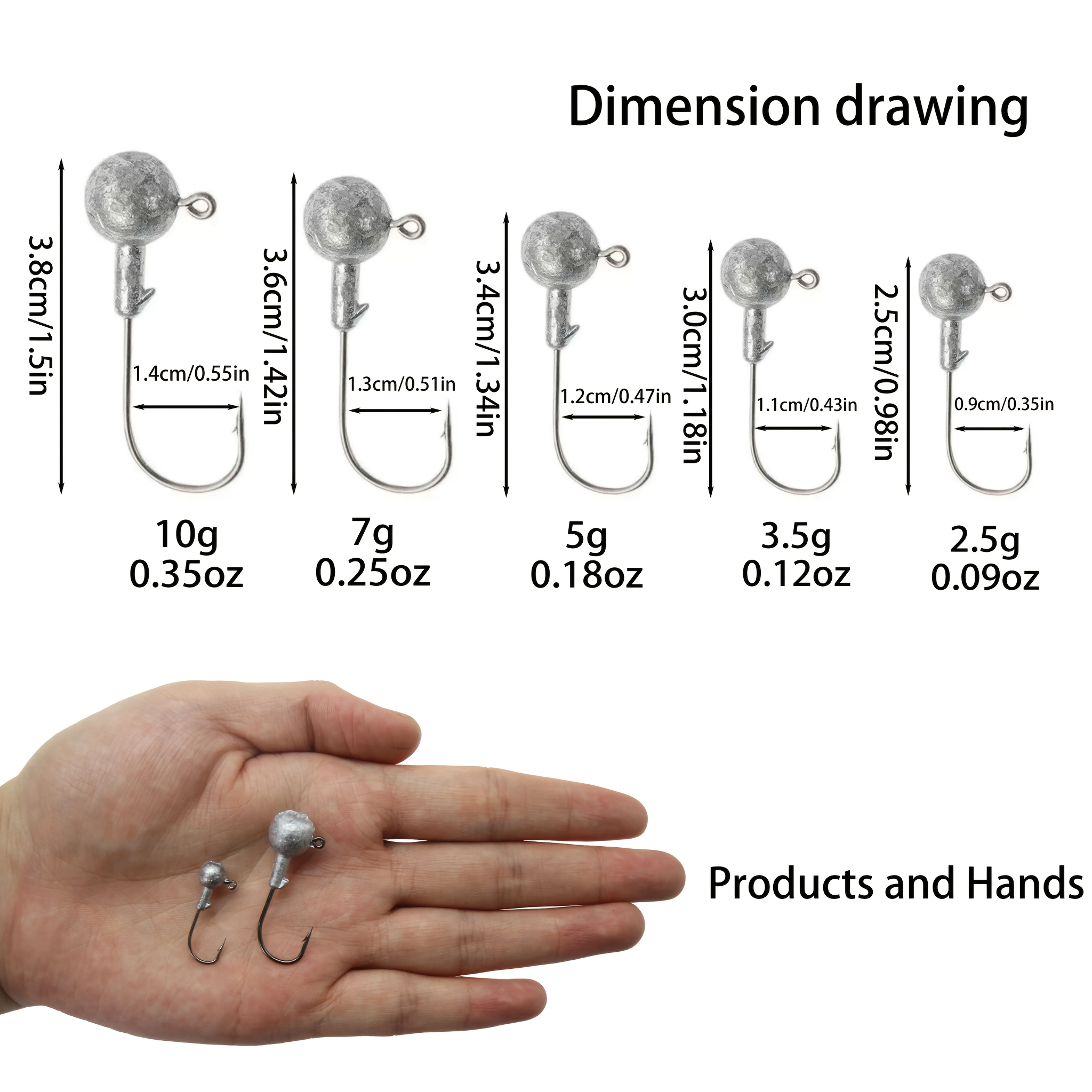 Opciones de peso múltiple: Elija entre 5 cabezales de plantilla ponderados con precisión (2,5 g, 3,5 g, 5 g, 7 g, 10 g) para adaptarse a diferentes profundidades y corrientes, perfectos para especies de lubina, lucioperca o agua salada.