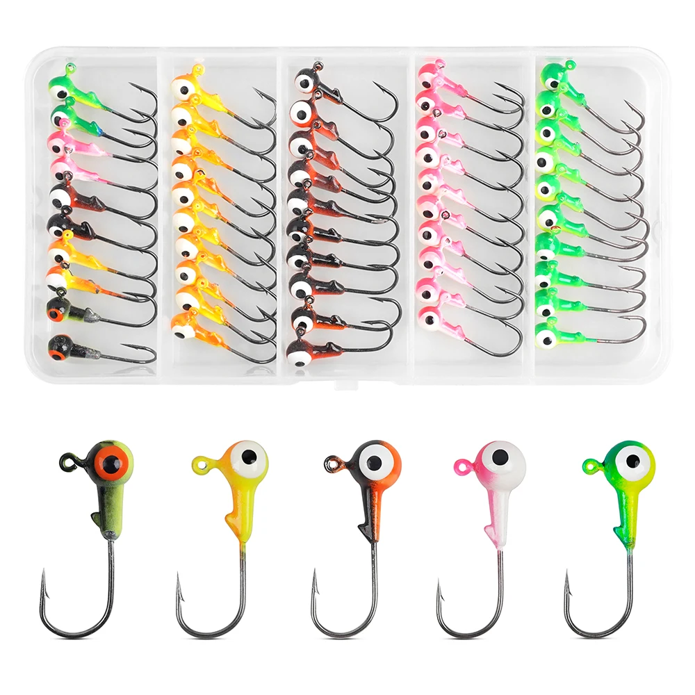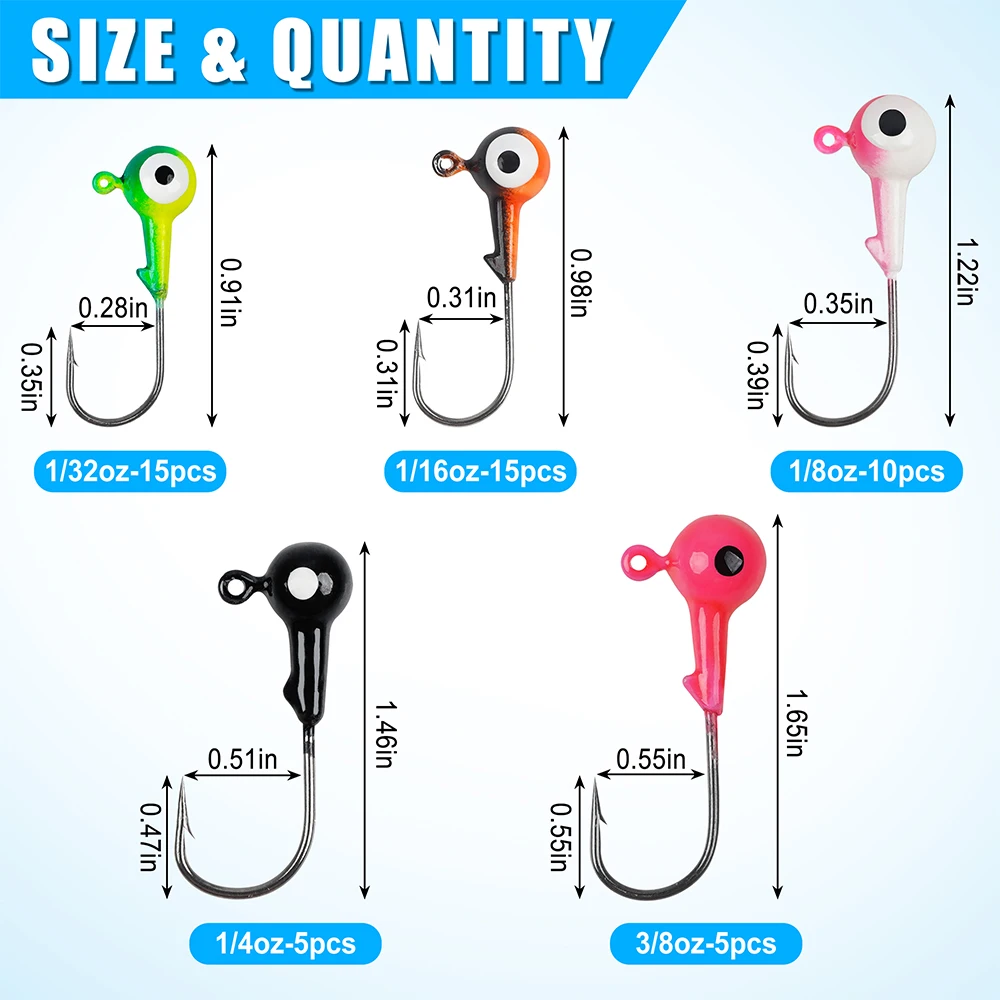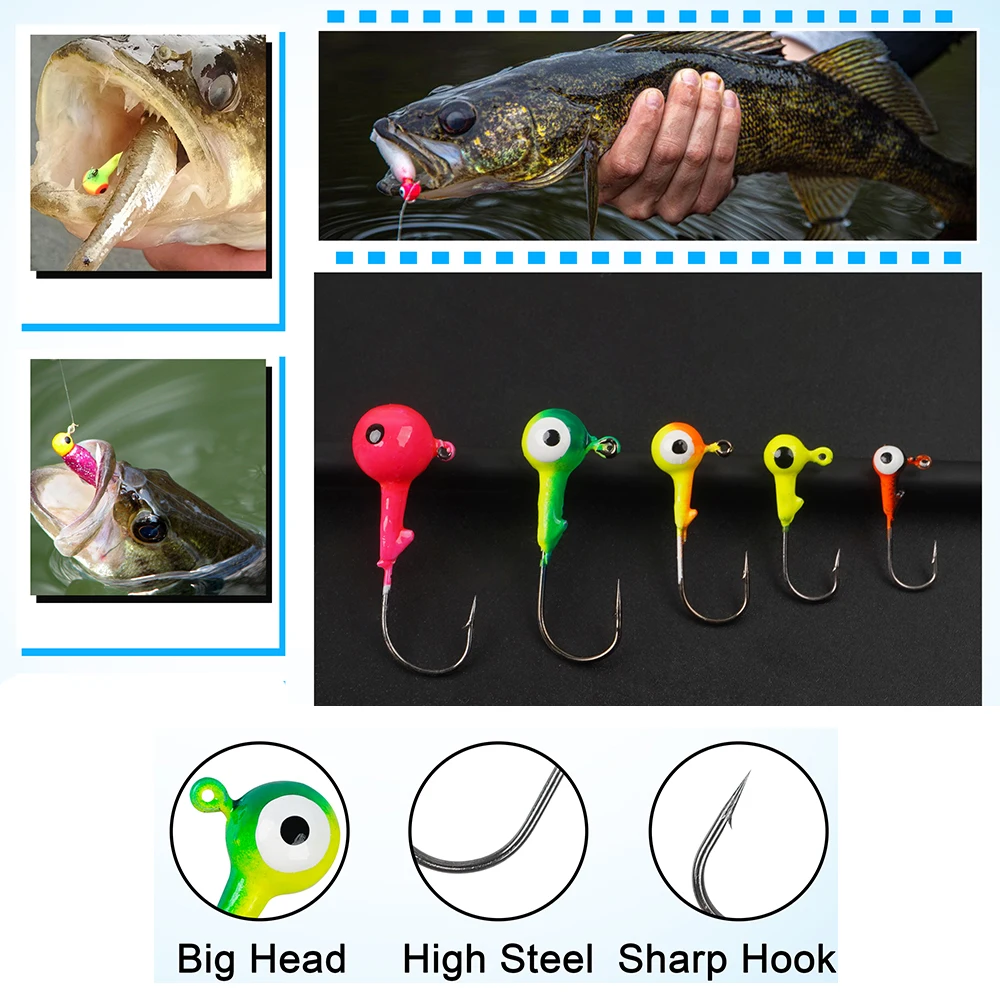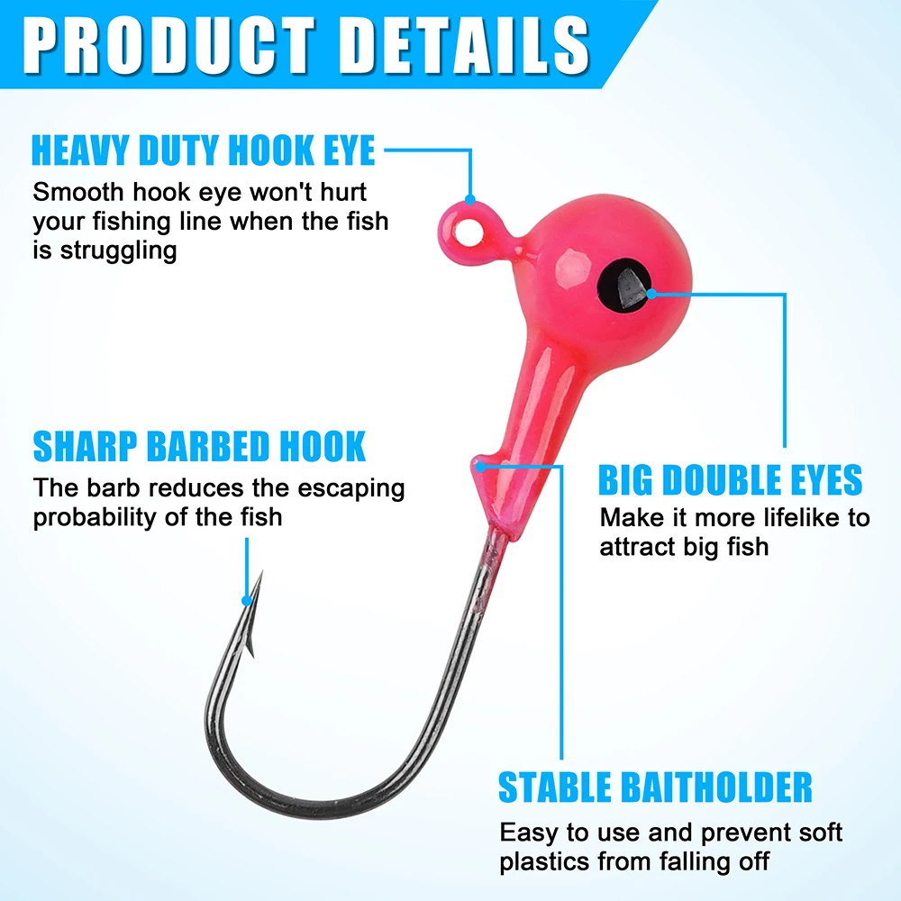 3.Las plantillas con cabeza de bola para señuelos de pesca están integradas en púas para una fácil fijación del cebo, construidas con anzuelos puntiagudos, aumentan sus posibilidades de capturar peces más grandes.(Nota: Es posible que algunos ojales estén pintados, puedes pincharlos con el gancho).