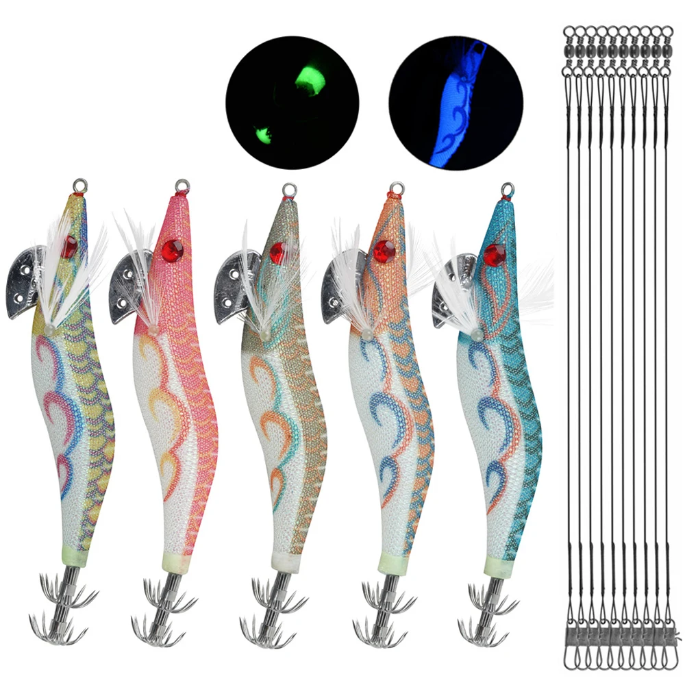 Anzuelos de Calamar Luminosos para Agua Salada, Señuelo de Madera, Pulpo, Sepia, Camarón, 2,5, 3,0, 15 Unidades