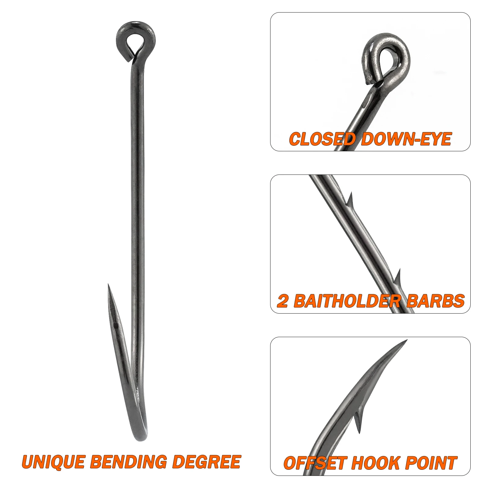 Fijación eficiente del Cebo:Dos púas en la parte posterior del vástago largo bloquean el cebo firmemente en su lugar y evitan que se caiga del anzuelo mientras pesca.