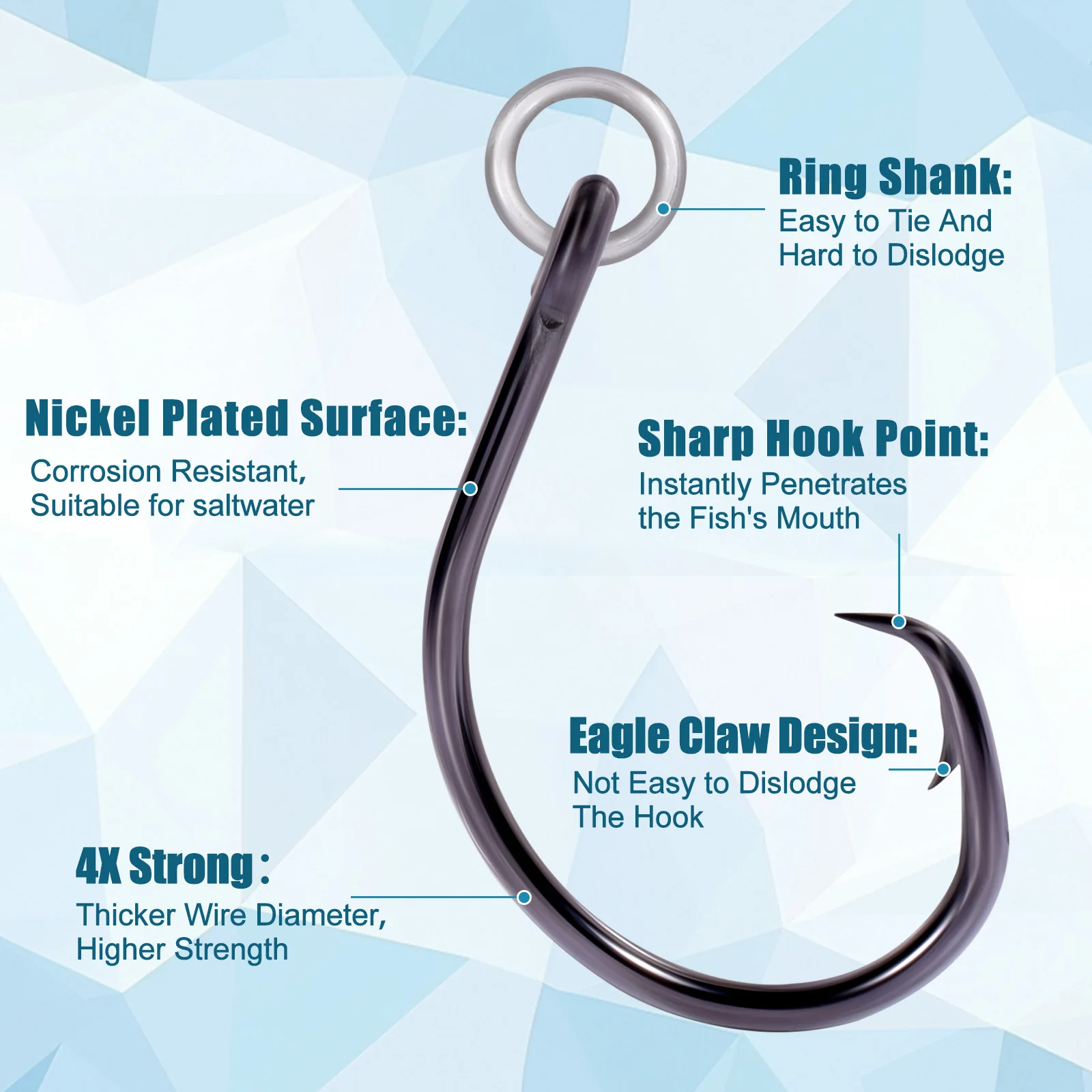 ¡El anzuelo circular con anillos pesados está diseñado para una amplia gama de aplicaciones, lo que lo hace adecuado tanto para la pesca costera como en alta mar con cebos vivos o trozos!