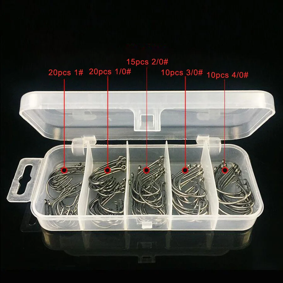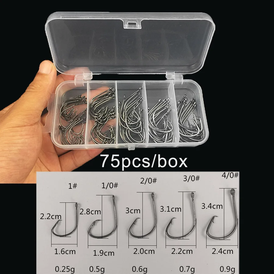 1. El paquete incluye: 75 ganchos circulares fuertes en una caja de plástico reutilizable. 20 piezas tamaño 1#, 20 piezas tamaño 1/0#,15 piezas tamaño 2/0#,10 piezas tamaño 3/0#,10 piezas tamaño 4/0#Tamaño de la caja: 13,3 cm * 6,2 cm * 2,5 cm.