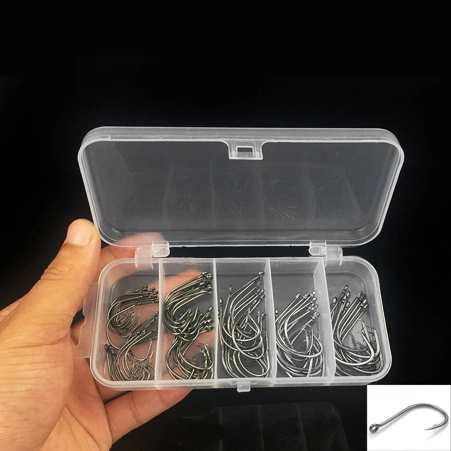 1. El paquete incluye: 75 ganchos circulares fuertes en una caja de plástico reutilizable. 20 piezas tamaño 1#, 20 piezas tamaño 1/0#,15 piezas tamaño 2/0#,10 piezas tamaño 3/0#,10 piezas tamaño 4/0#Tamaño de la caja: 13,3 cm * 6,2 cm * 2,5 cm.