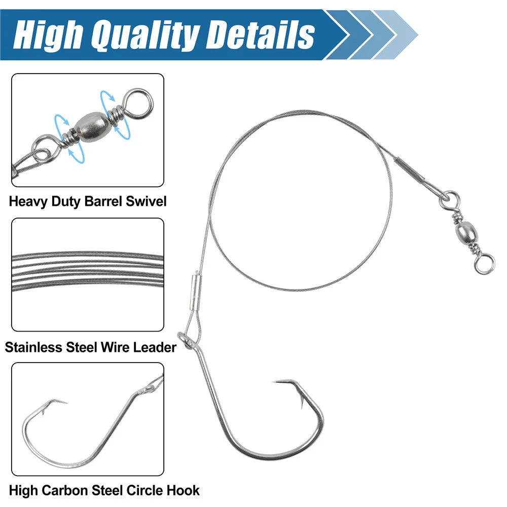 2. Los anzuelos de pesca están hechos de material grueso de acero inoxidable y equipados con una línea líder de 7 hilos, el cable líder de pesca es lo suficientemente fuerte como para atrapar peces grandes, ideal para la pesca en agua salada y dulce.