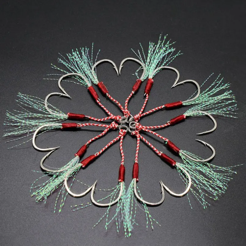 Anzuelos de doble asistencia con pluma para Jigging Vertical, señuelo de plantilla de paso lento, reemplazo de anzuelo de agua salada, 10 piezas