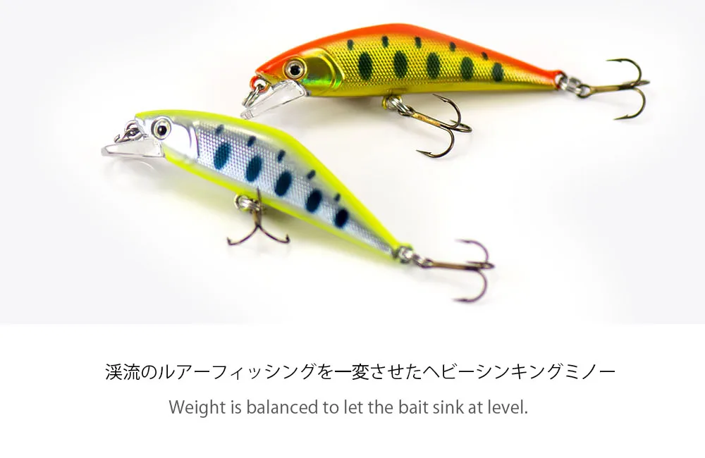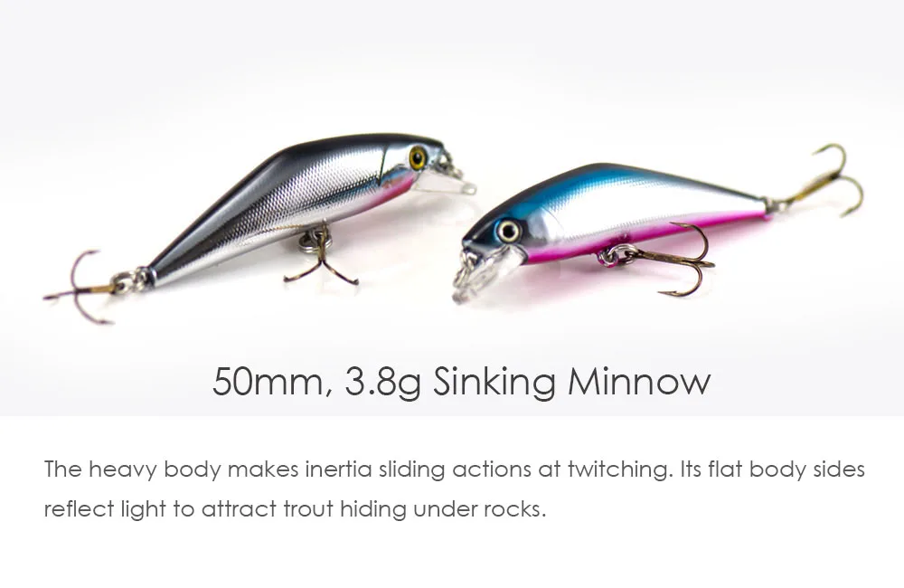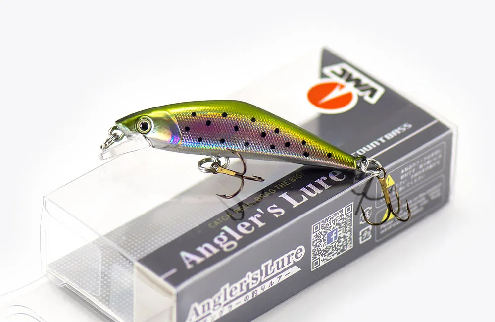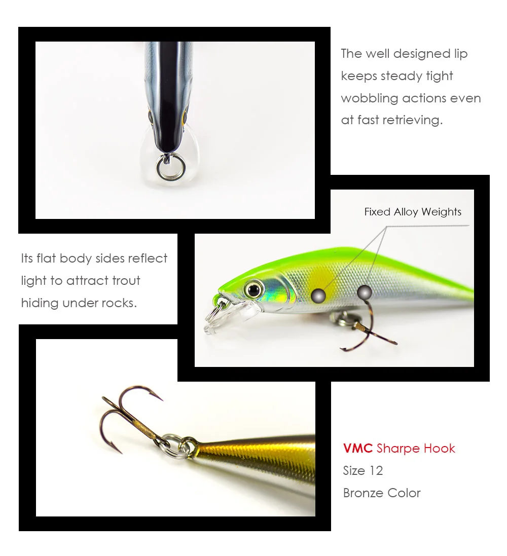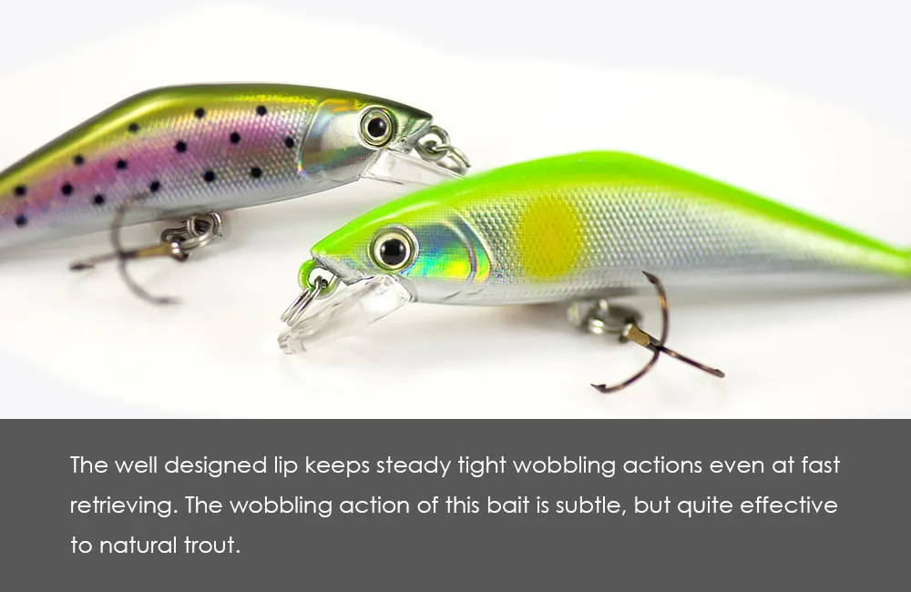 Sus lados planos reflejan la luz para atraer truchas que se esconden debajo de las rocas. El labio bien diseñado mantiene acciones de tambaleo firmes incluso en la recuperación rápida. La acción de tambaleo de este cebo es sutil, pero bastante efectiva para la trucha natural. El peso se equilibra para que el cebo se hunda al mismo nivel.