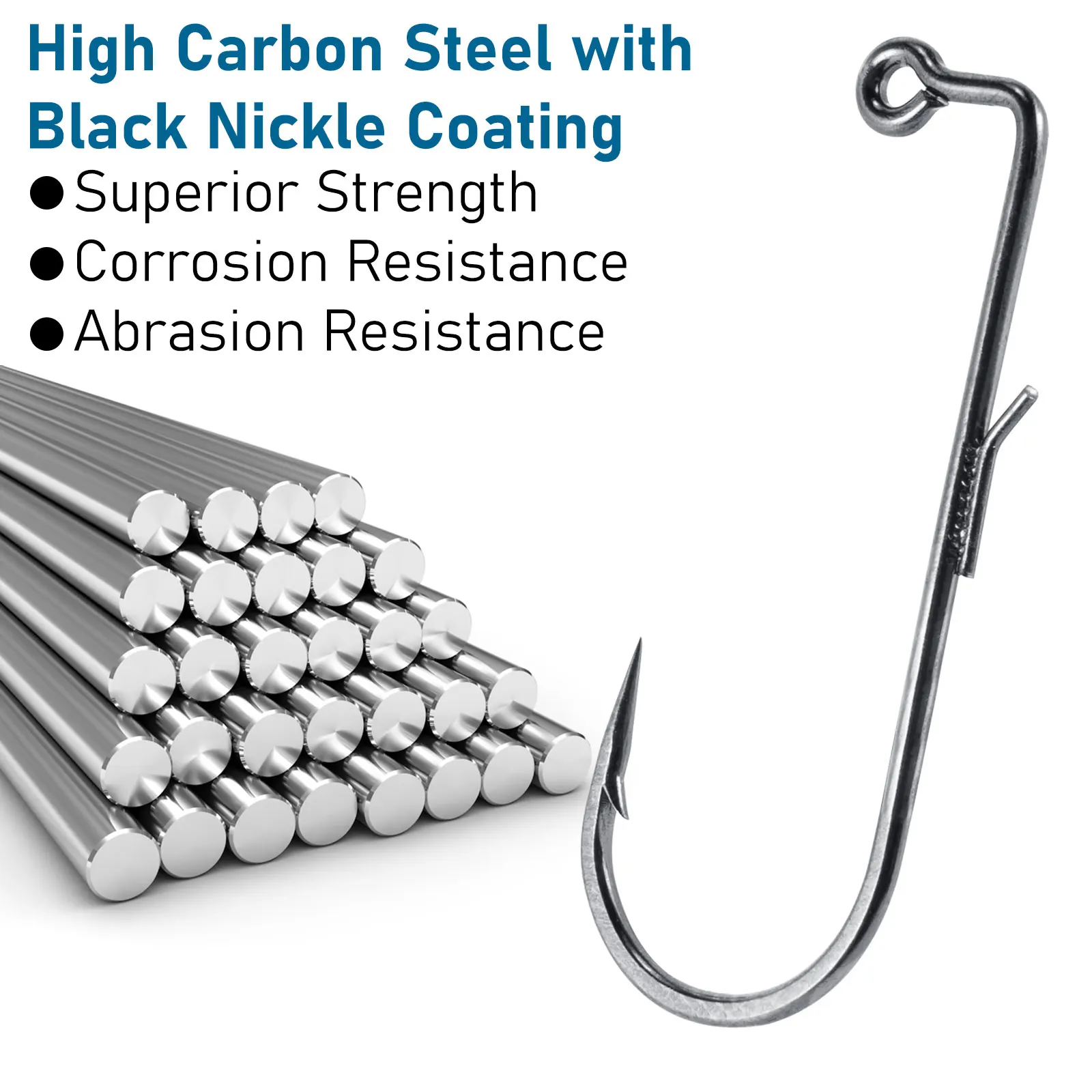 Alta resistencia: el acero con alto contenido de carbono con revestimiento de níquel negro garantiza resistencia y durabilidad superiores, proporciona a estos anzuelos de pesca un peso más liviano, un 20% más de resistencia, también ayuda a proteger los anzuelos y previene la oxidación.