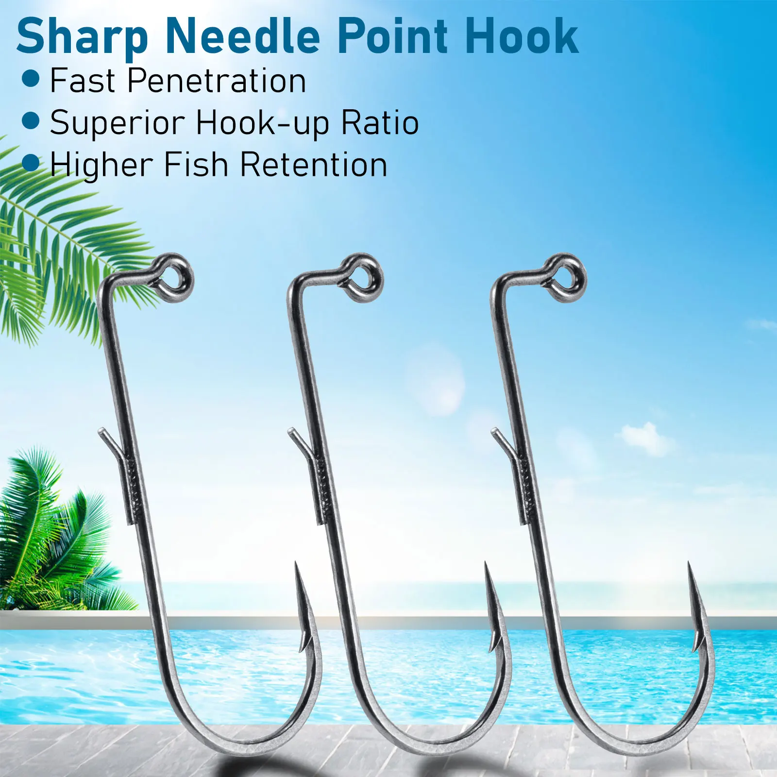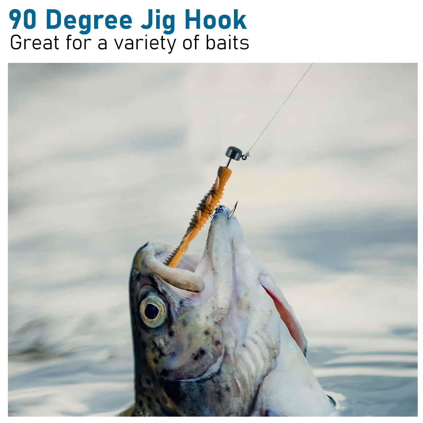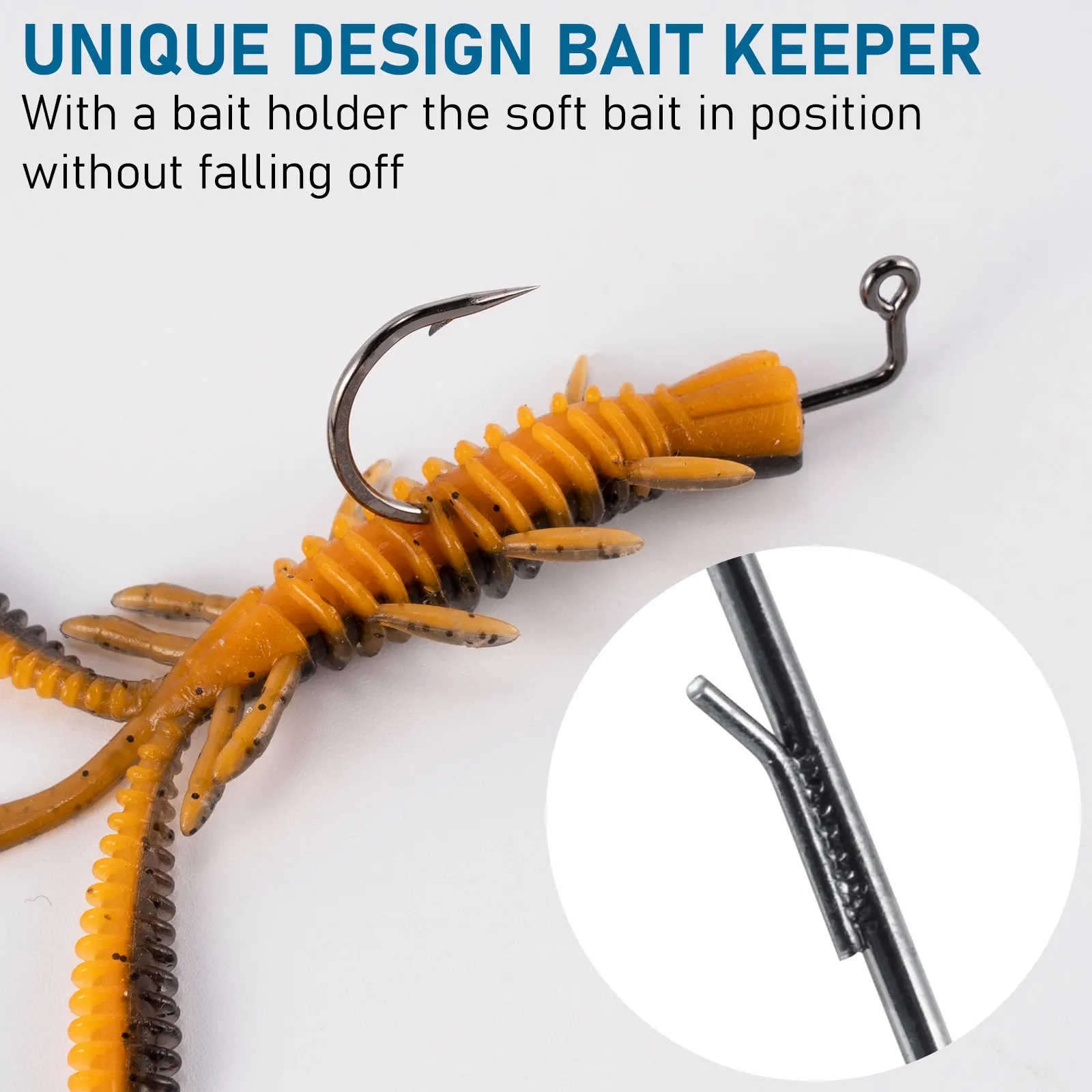 Diseño único: vástago de ojo de 90 grados, la curva única fuerza a los peces hacia el codo, lo que hace prácticamente imposible lanzar el anzuelo. El soporte para cebo en la parte posterior del vástago bloquea el cebo firmemente en su lugar y evita que se caiga del anzuelo mientras pesca..