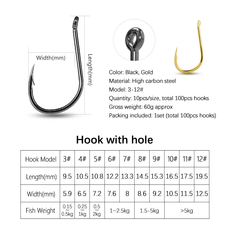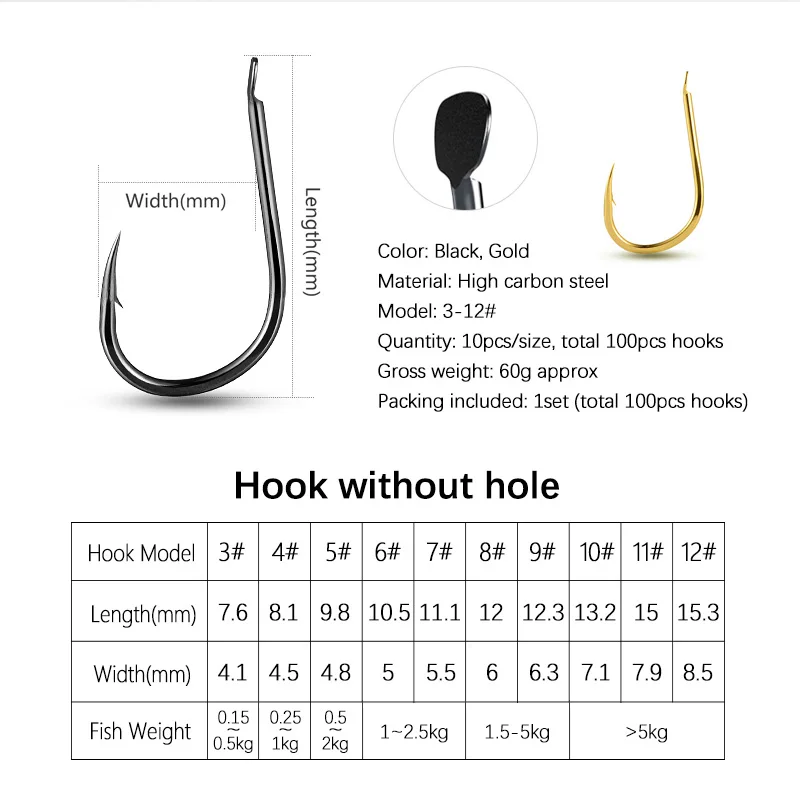 10 tamaños en total, 10 tamaños/tamaño; 100 ganchos en total.