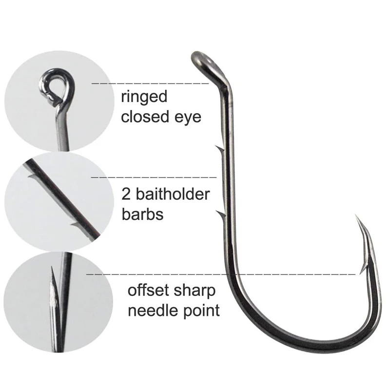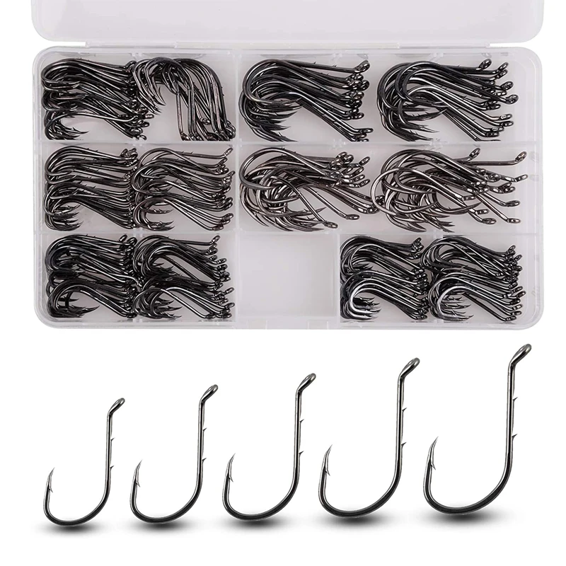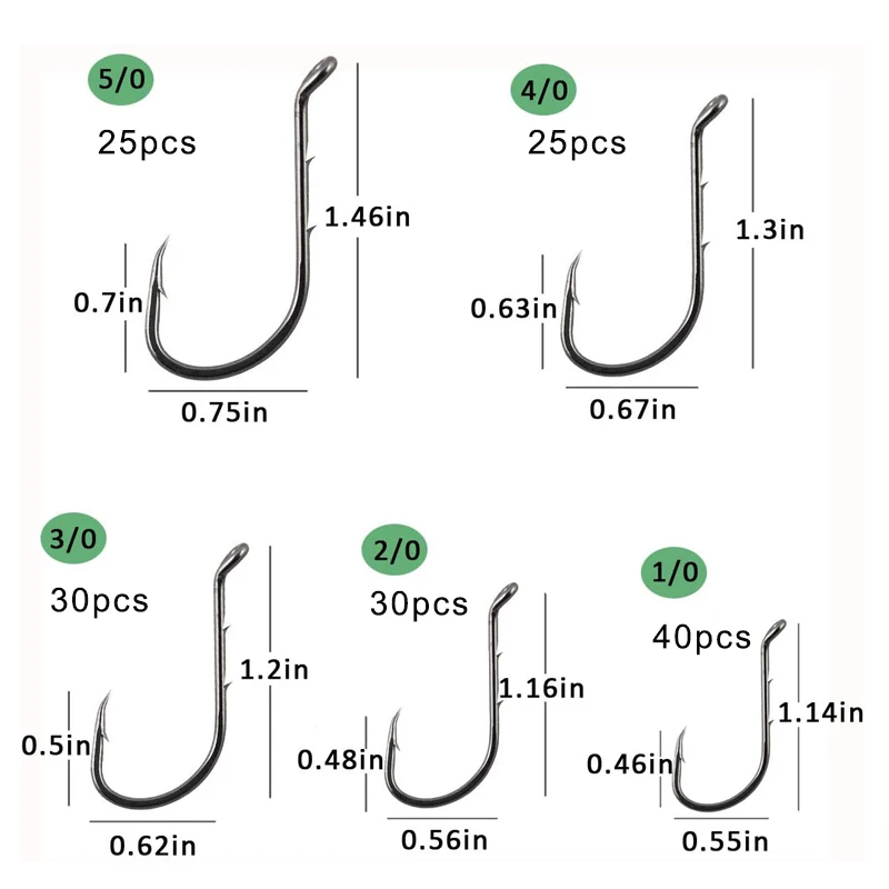 Cantidad: 150 Uds. Material: acero al carbono Tamaño: 1/0, 2/0, 3/0, 4/0, 5/0 Paquete: caja de plástico Características: Diseño de púas traseras para soporte de cebo, más conveniente para la pesca con señuelos Mezcla de diferentes tamaños, más opciones Paquete de caja de plástico, fácil de llevar Nota: puede haber algunos errores de medición, no se preocupe. Gracias