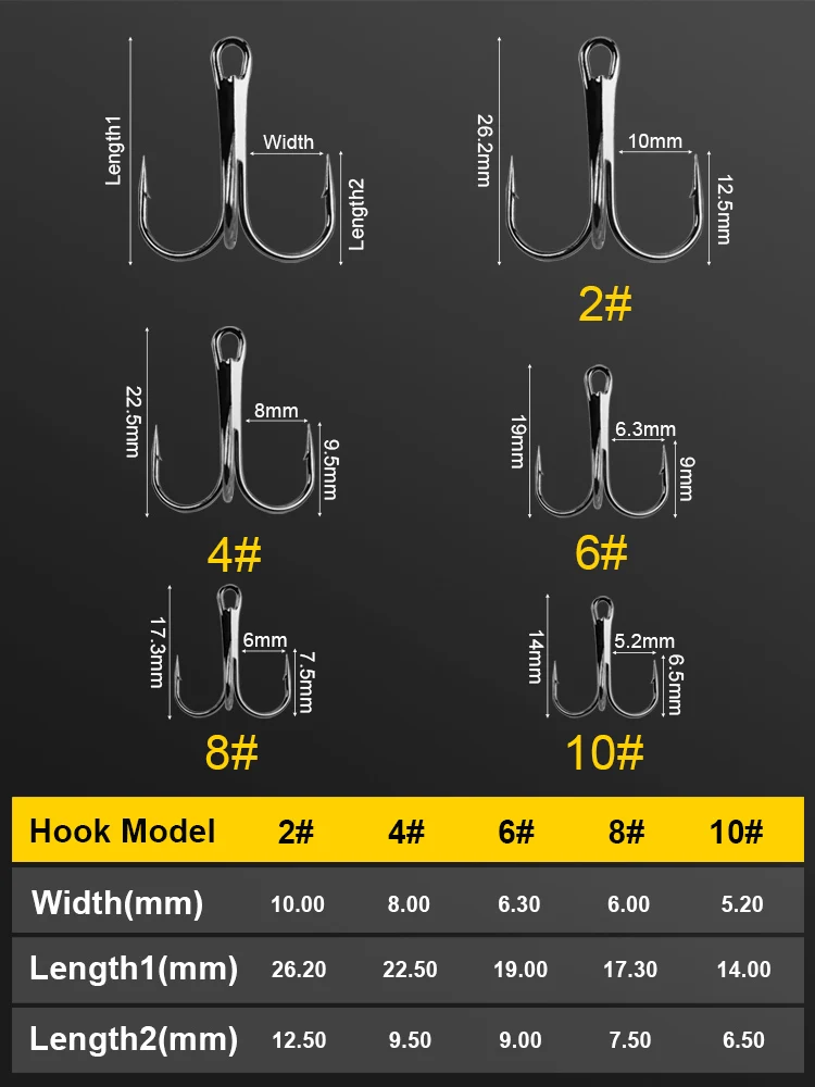 • Juego versátil: El juego incluye 50 piezas de anzuelos de pesca triples, adecuados para varios escenarios de pesca.