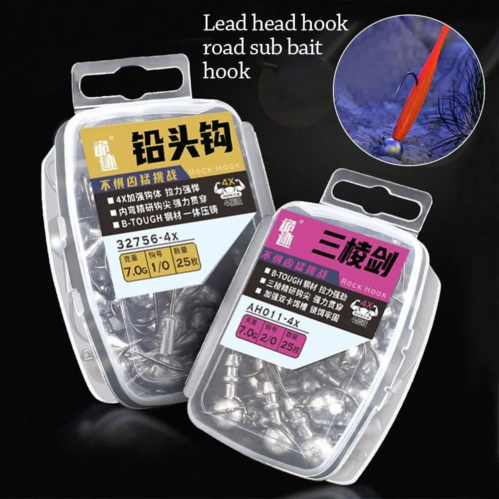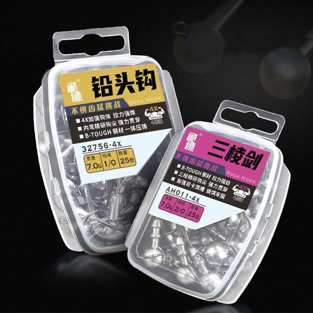 Name: Jig Head Hook for Soft Lure Material: Titanium Alloy Hook size: 2g/3.5g/5g/7g/10g/12g/14g Round head jig hook is to avoid missing . Screw thread shape is the special of this hook, which make the soft more stronger. Package included: 25pcs Sharp Fishing Jig Hooks(with box)